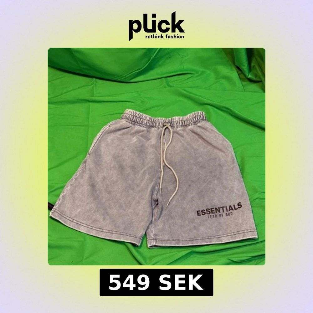 Säljer ett par grå shorts från Essentials Fear of God med tvättad look. De har elastisk midja med snörning, sidofickor och en bakficka. Loggan är tryckt framtill. Perfekta för chill dagar och streetwear-stil.Liknande modell som originalet!