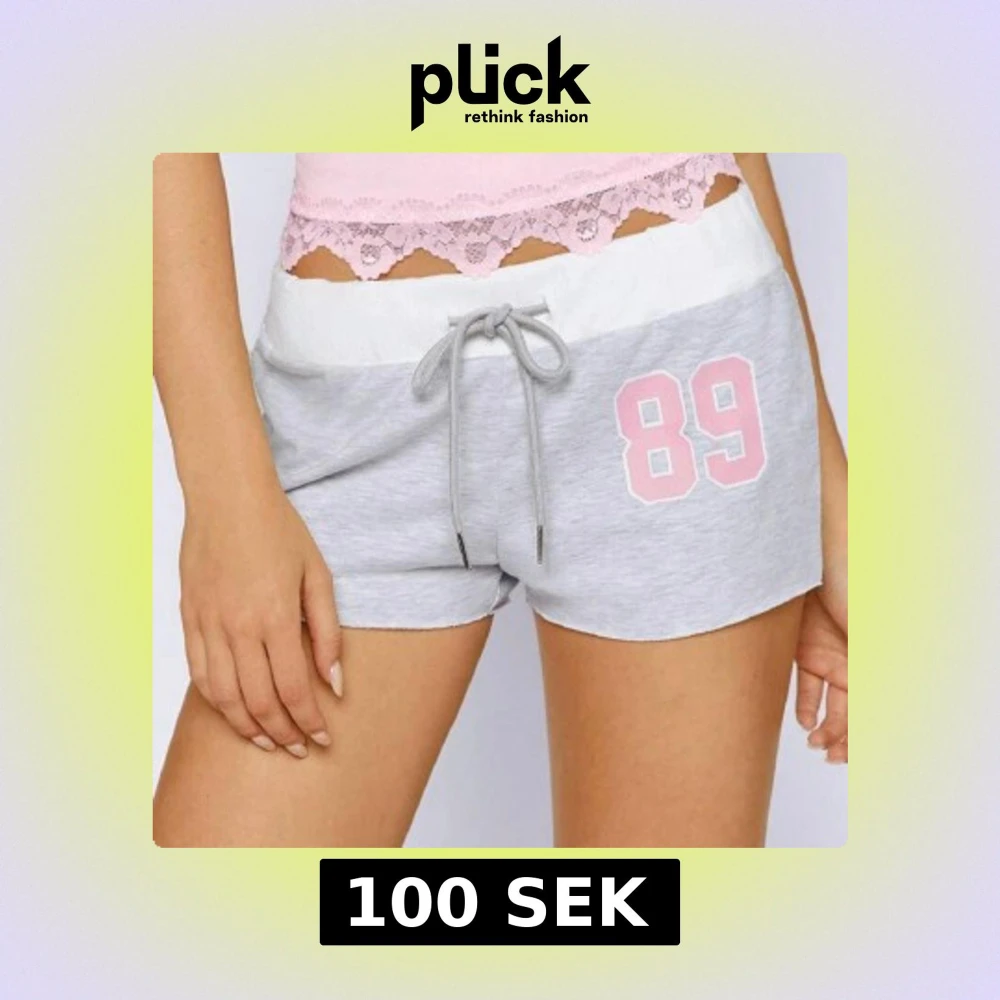 Snygga grå shorts med vit midja och snörning framtill. På ena benet finns ett rosa tryck med siffran 89. Perfekta för chill dagar eller träning. Mjukt material som känns skönt mot huden och ger en avslappnad vibe.
