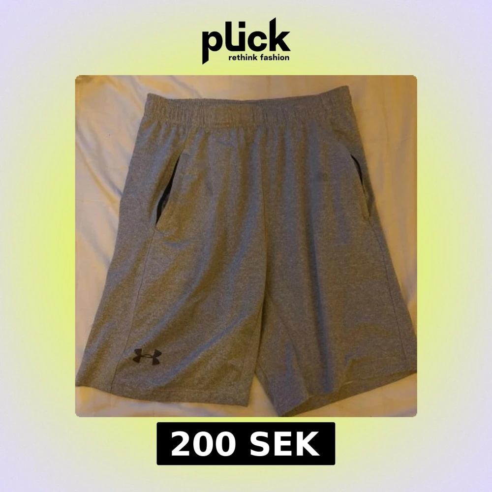 Säljer ett par grå träningsshorts från Under Armour med elastisk midja och två sidofickor. Shortsen har en snygg logga framtill och stor text på baksidan. Perfekta för gymmet eller löprundan, tillverkade i mjuk och lätt polyester.