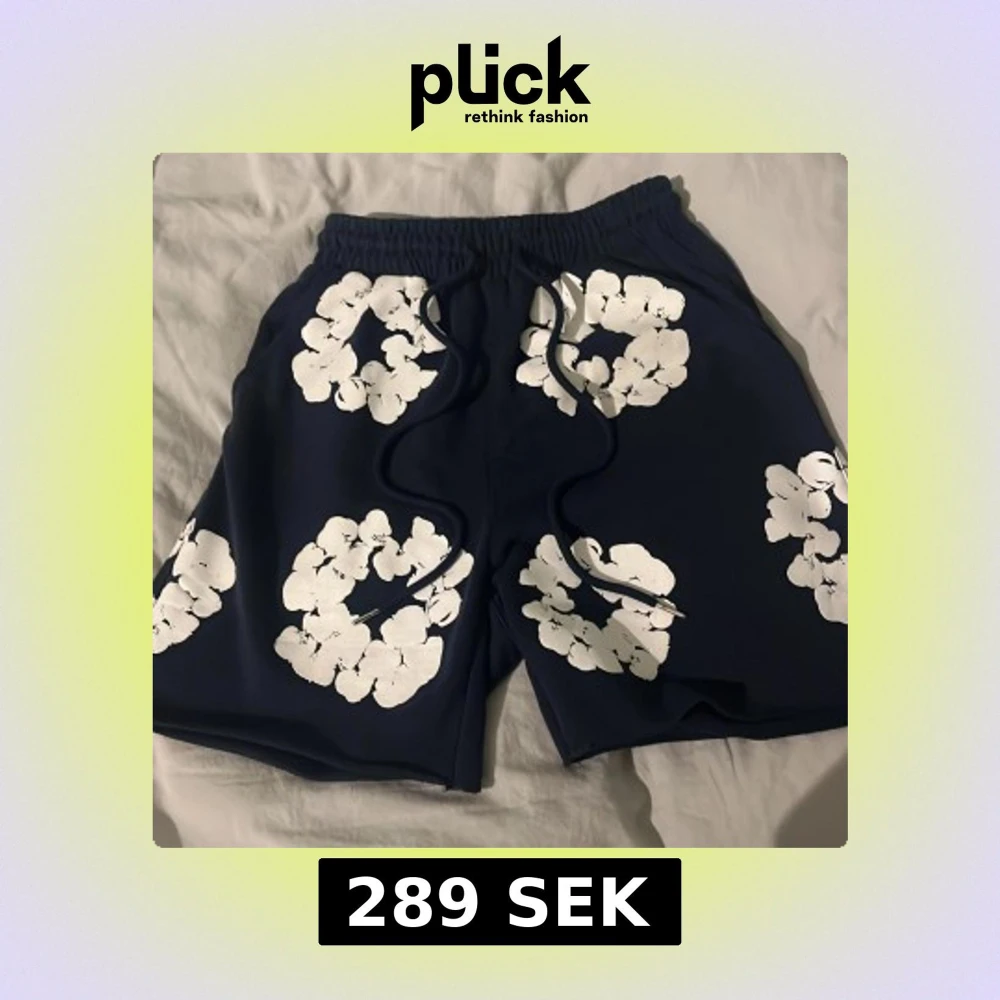 Säljer ett par mörkblå shorts från Denim Tears med stora vita blommönster över hela plagget. Shortsen har elastisk midja med snörning och en bakficka. Perfekta för sommaren och ger en chill vibe. Perfekt för dig som vill bli få en glowup