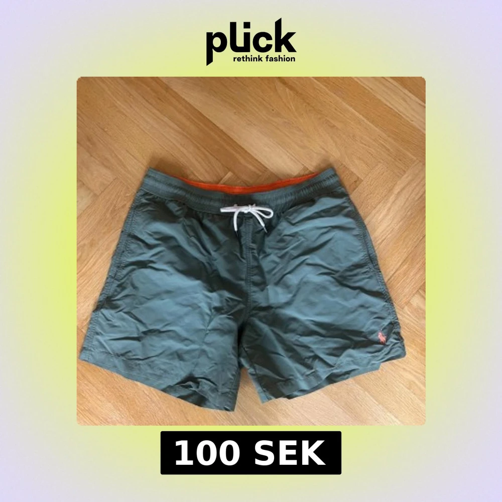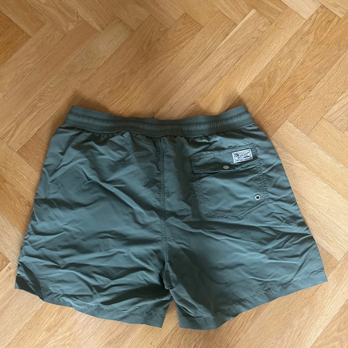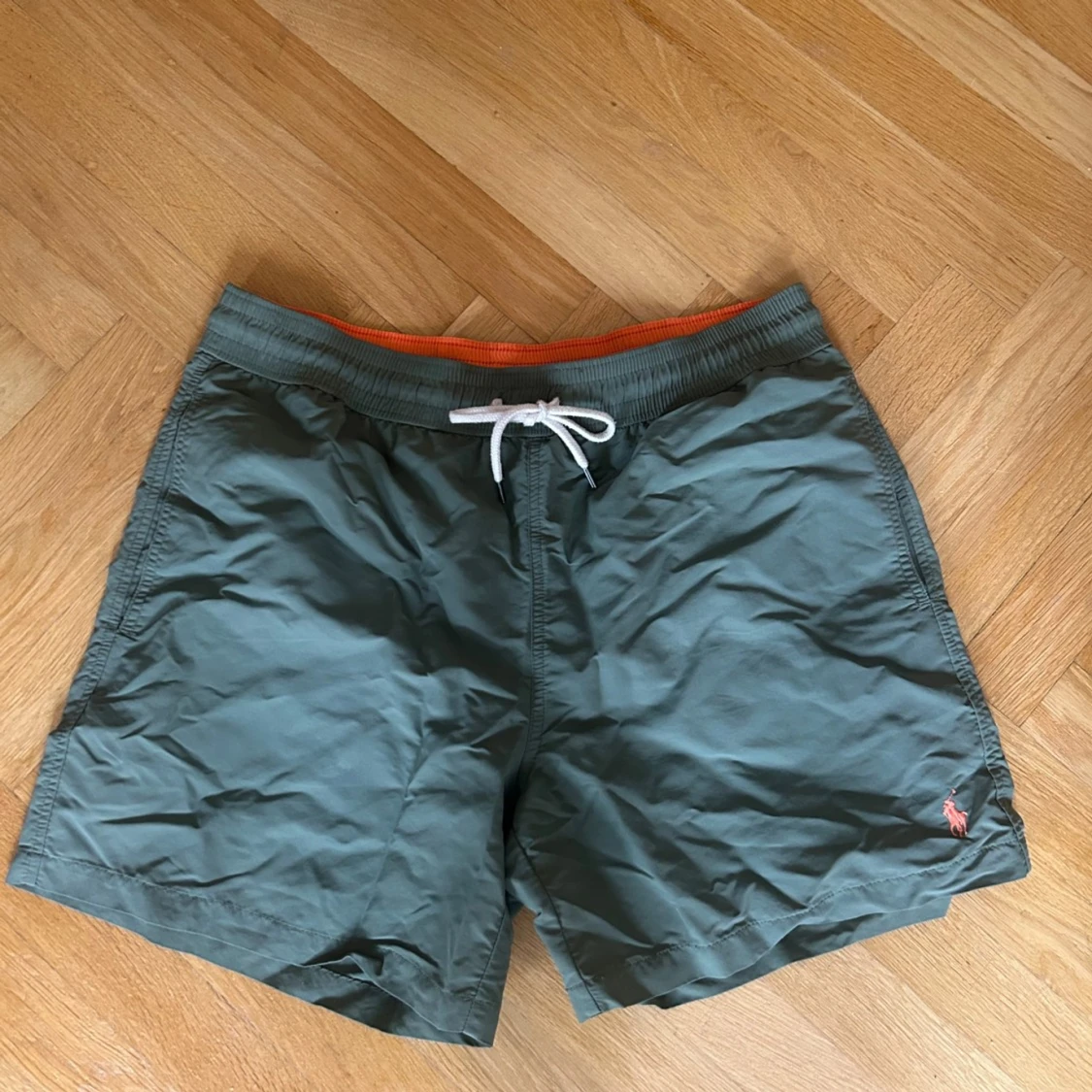 Snygga gröna badshorts från Polo Ralph Lauren i gott skick med orange resår i midjan och vit snörning. Klassisk passform och bakficka med knapp. Perfekta för stranden eller poolen, med diskret logga broderad framtill.