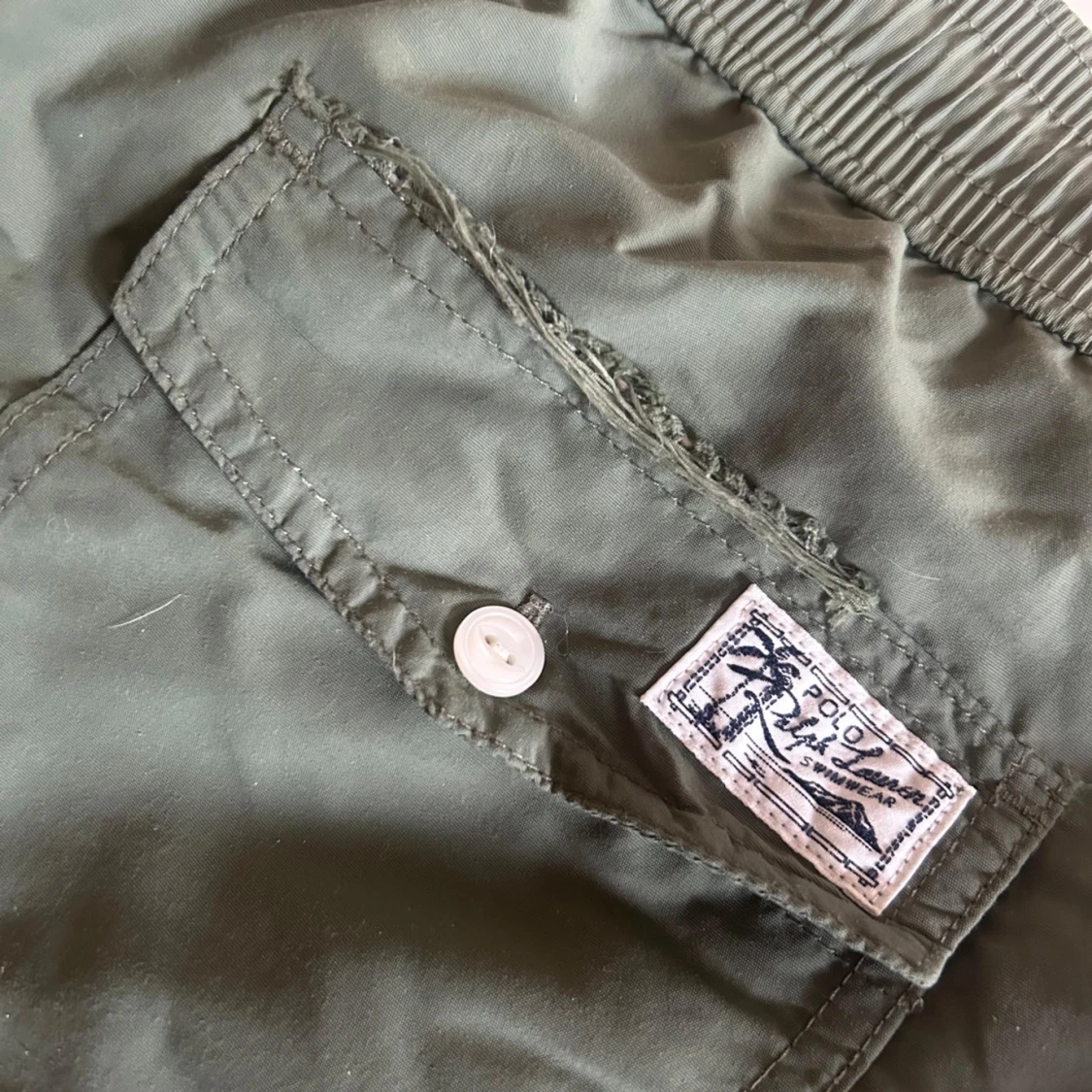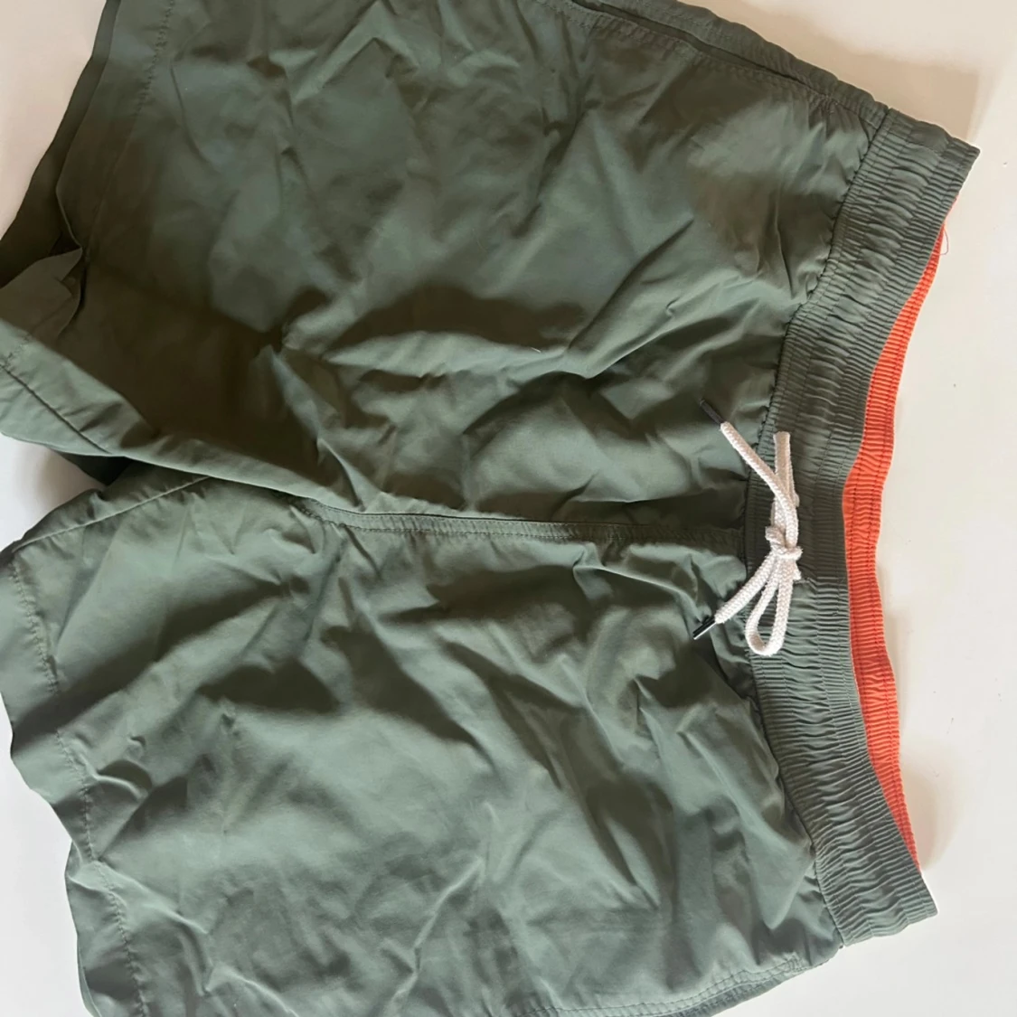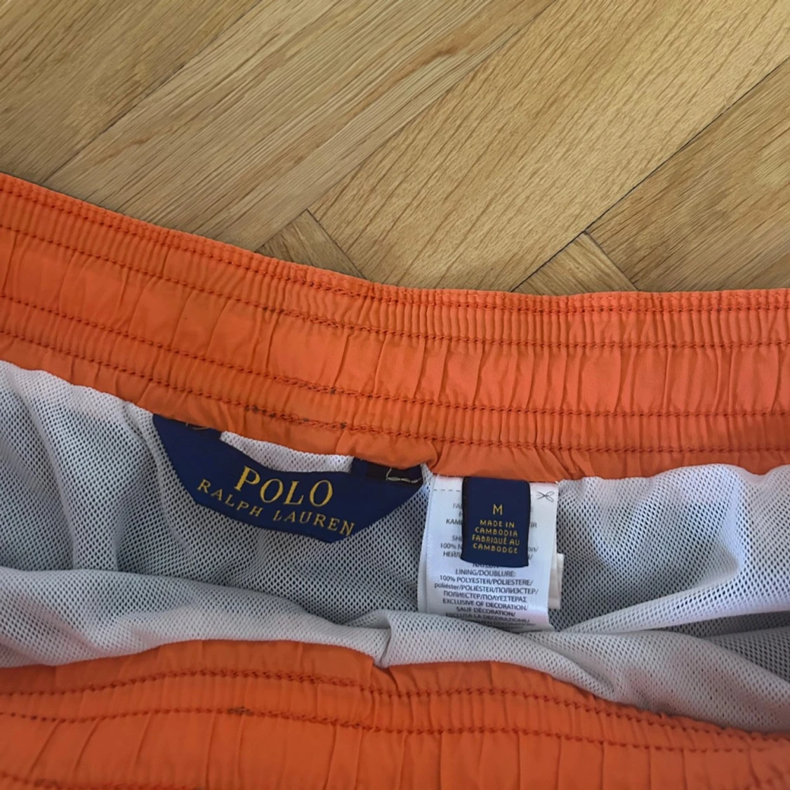Snygga gröna badshorts från Polo Ralph Lauren i gott skick med orange resår i midjan och vit snörning. Klassisk passform och bakficka med knapp. Perfekta för stranden eller poolen, med diskret logga broderad framtill.