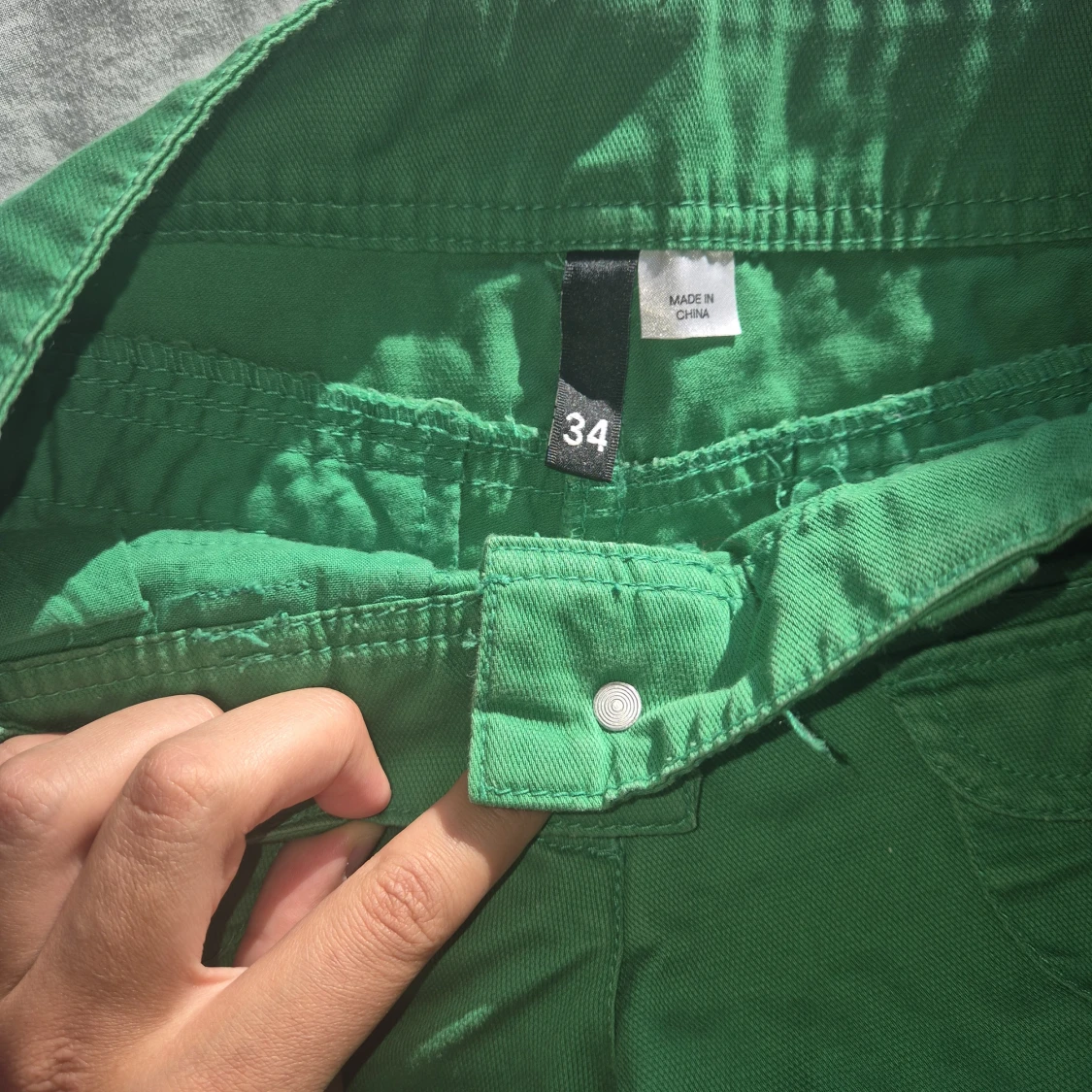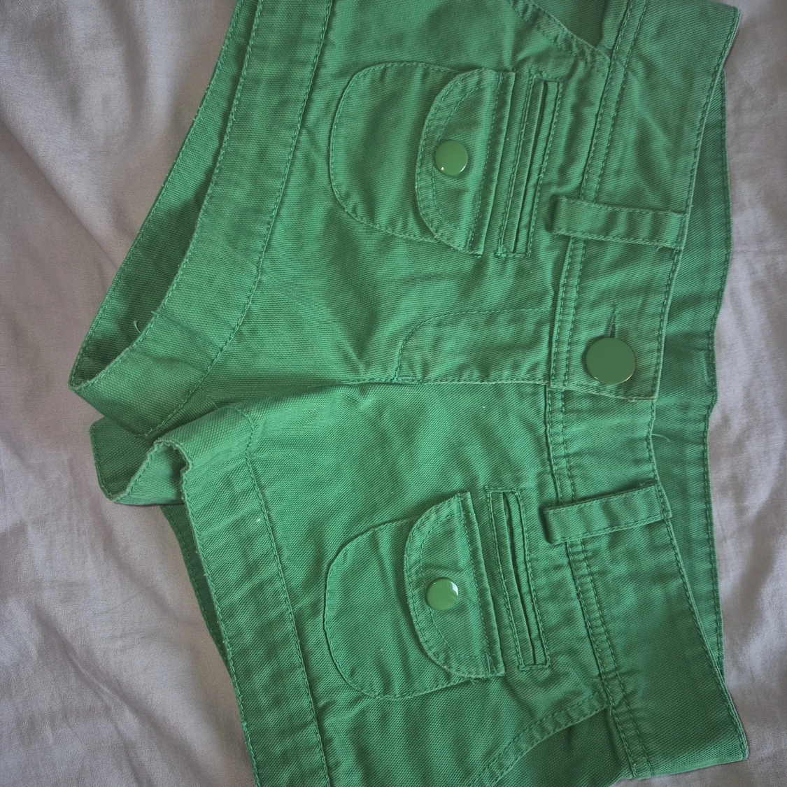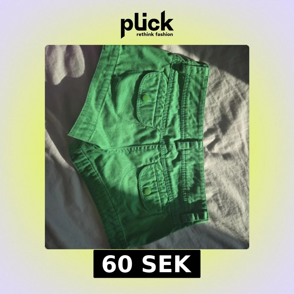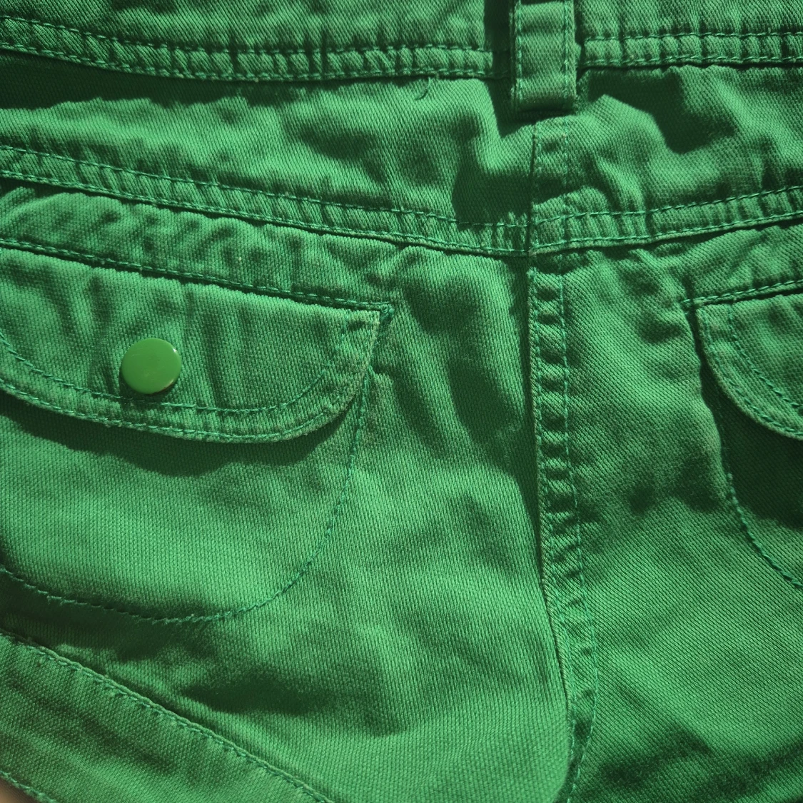 Snygga gröna shorts i bomull med coola fickor framtill och matchande gröna knappar. Modellen är kort och har bälteshällor, perfekt för dig som gillar färg och vill sticka ut. Knappt använda, säljer dem för att det för för små.