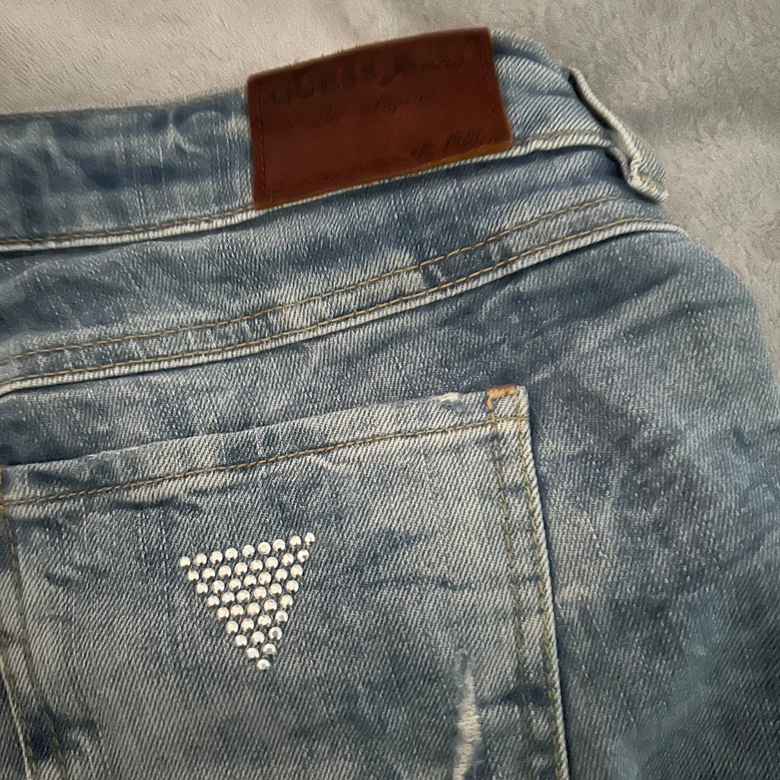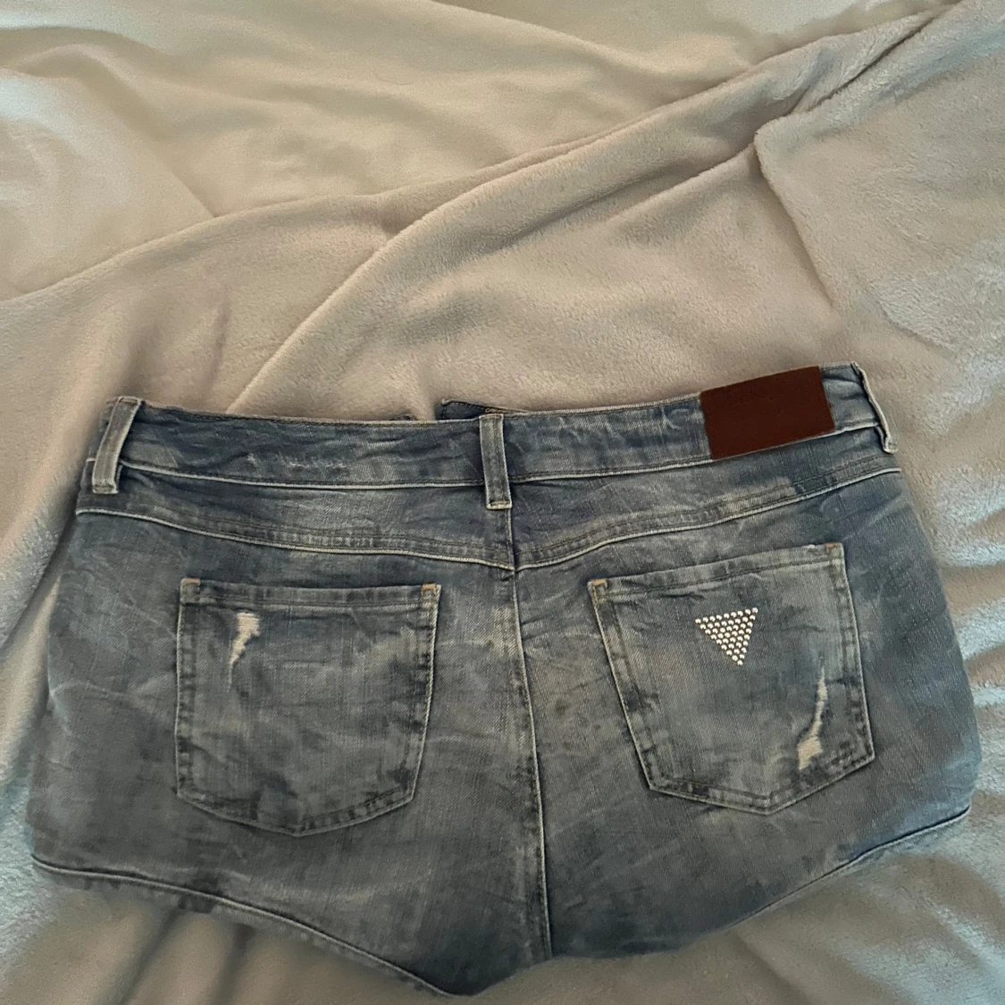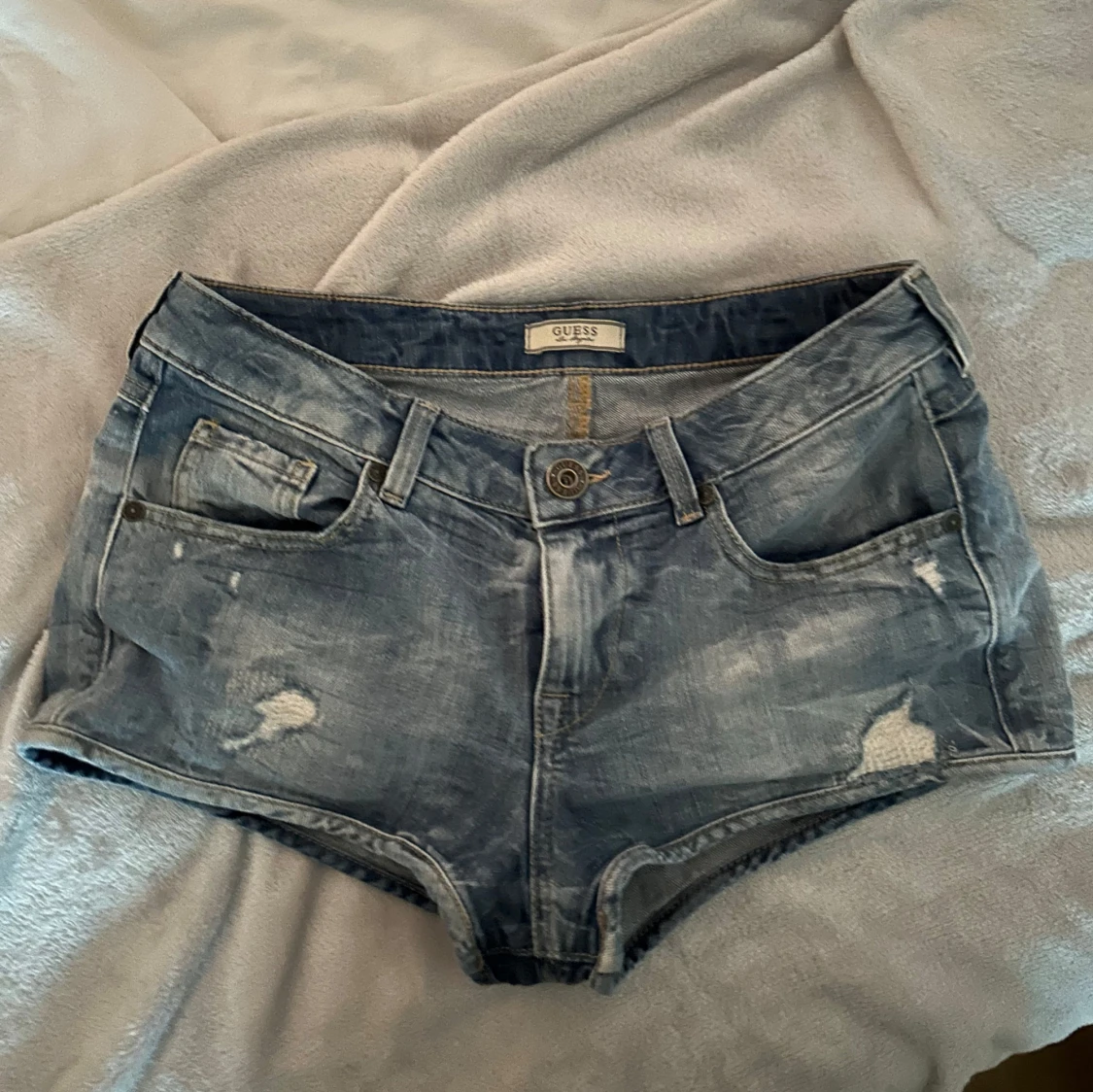 Snygga blå jeansshorts från Guess med slitna detaljer och klassisk femficksdesign. Shortsen har låg midja, bälteshällor och en liten silvrig Guess-logga på bakfickan. Perfekta för sommaren och ger en cool, avslappnad vibe. Skriv vid frågor!!❣️
