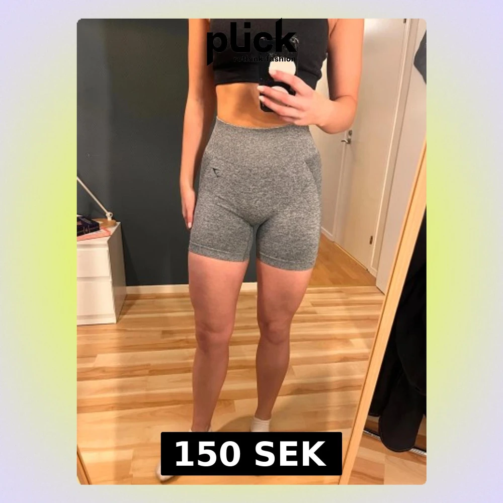 Säljer ett par helt oanvända, grå, högmidjade träningsshorts från Gymshark med svart logga på linningen. De är tighta och har en snygg, sportig passform som sitter skönt mot kroppen. Materialet är stretchigt och andas, perfekt för gymmet eller löprundan.