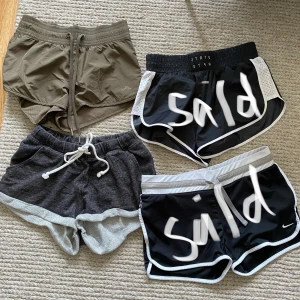 Militärgröna -> H&M strl. 34, Svarta uppe till höger -> H&M strl. 34, Gråa mjukisshorts -> H&M strl. XS, Svarta Nike -> strl. S! 50kr paret, frakt tillkommer om man inte bor i Halmstad 🥰💕
