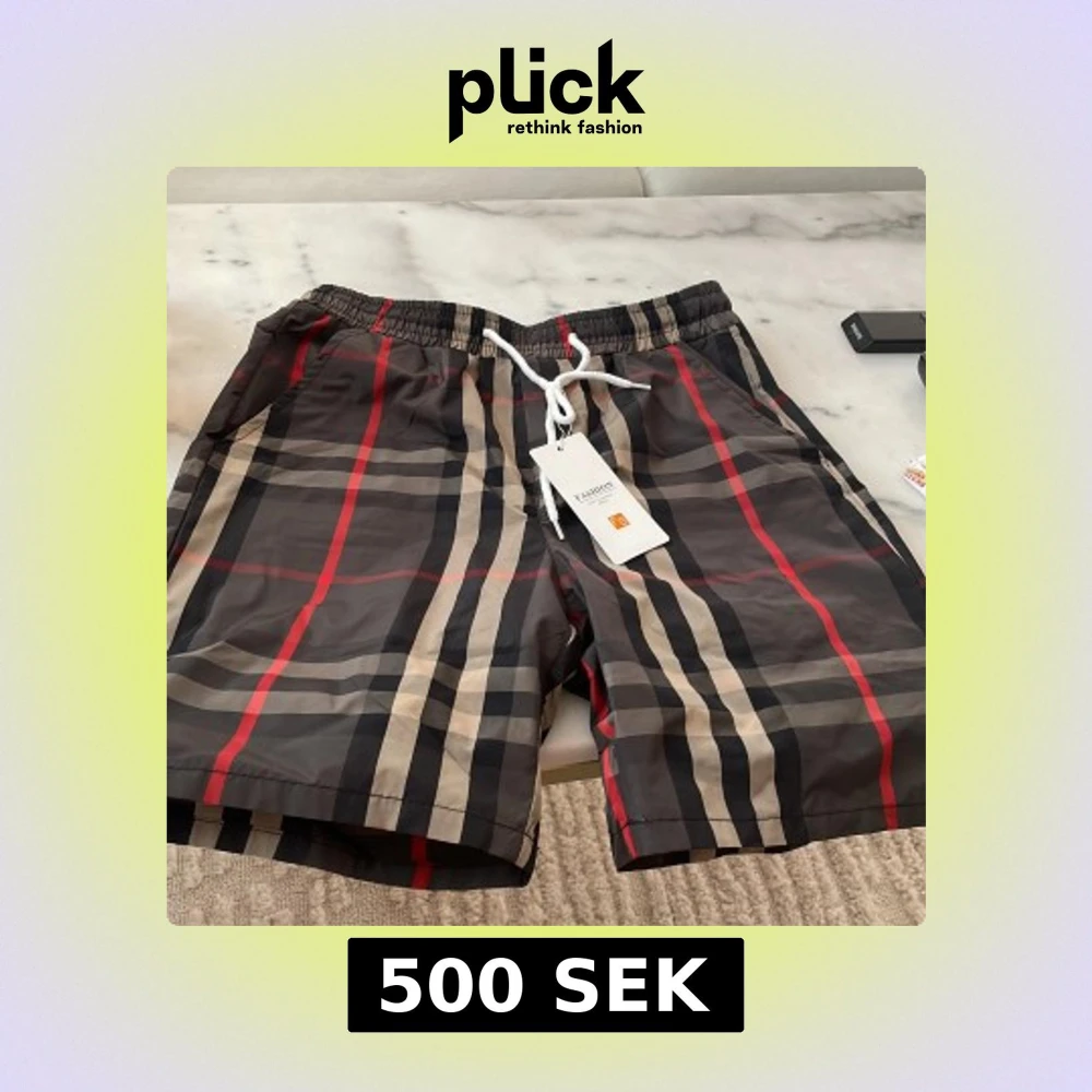 Snygga badshorts med rutigt mönster i svart, beige och rött. Shortsen har elastisk midja med vit snörning och sidofickor. Perfekta för sommardagar vid stranden eller poolen.