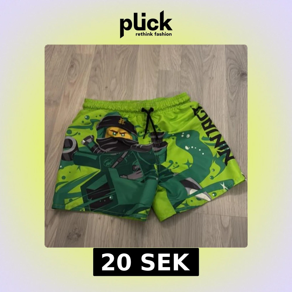Coola gröna badshorts med Ninjago-tryck från H&M. Perfekta för sommarens äventyr med elastisk midja och snörning för bästa passform. Tillverkade i lätt och bekvämt material.