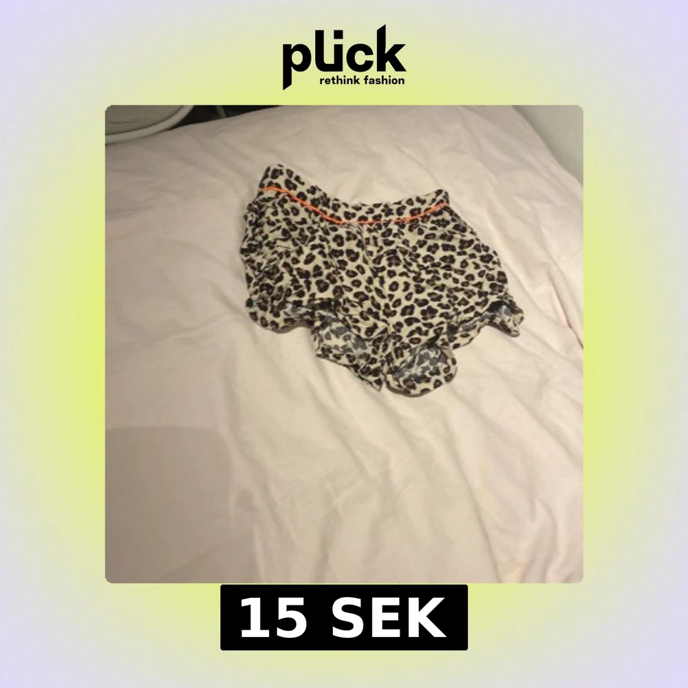 Snygga shorts med leopardmönster och volangkant. De har en beige bas med svarta och bruna fläckar samt en tunn orange linje i midjan som extra detalj. Perfekta för dig som vill sticka ut lite extra i sommarvärmen.