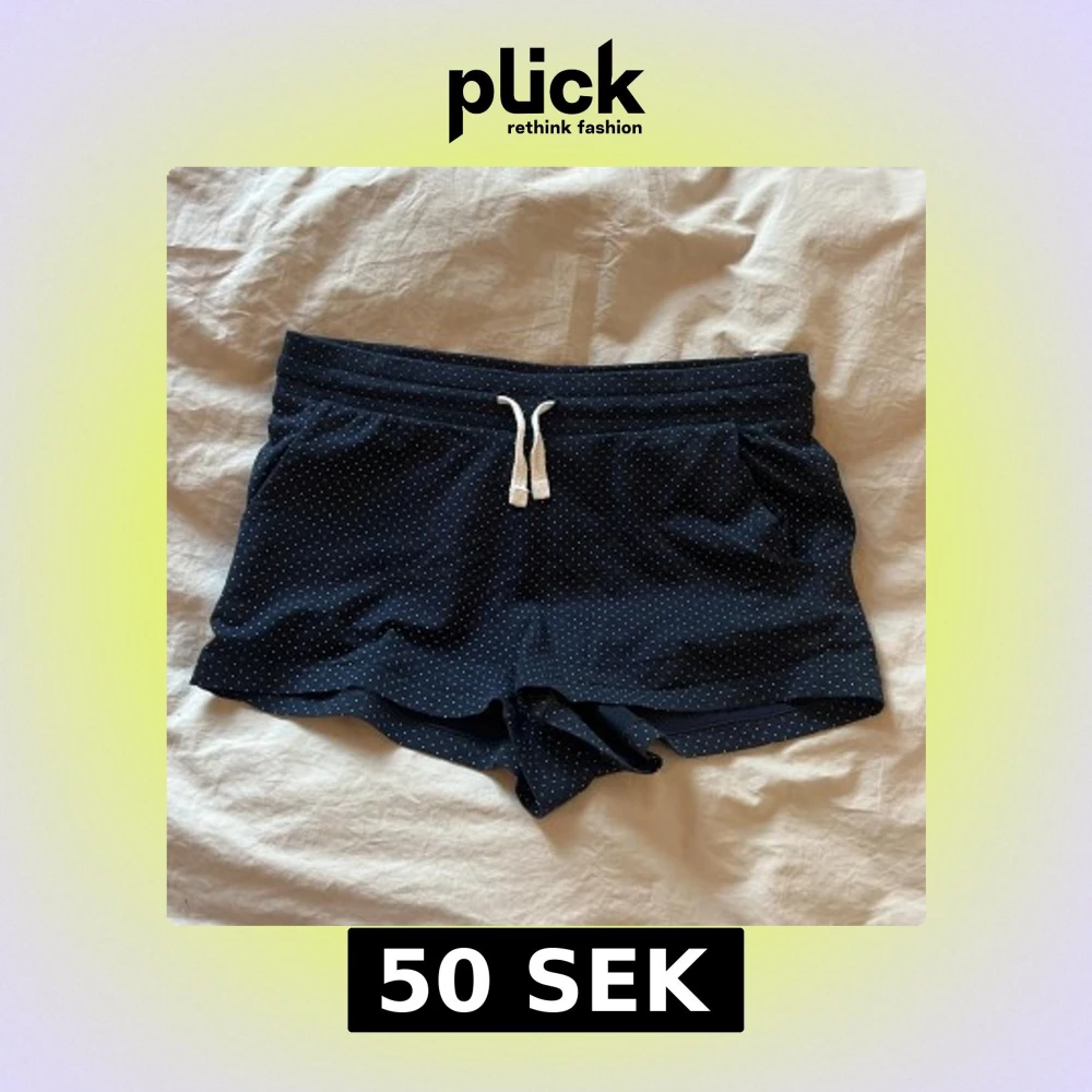 Säljer ett par mörkblå shorts från H&M med vita små prickar och snörning i midjan. De är gjorda i mjuk ekologisk bomull med lite stretch. Mycket bra skick utan fläckar eller slitage