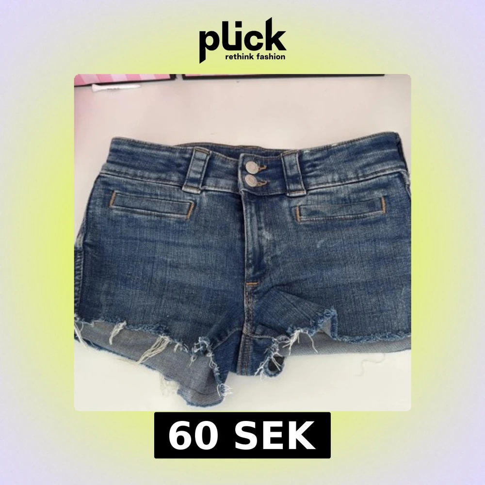 Snygga blå jeansshorts från H&M med låg midja och råa fransade benslut. Shortsen har dubbla knappar framtill, bälteshällor och fickor både fram och bak. Perfekta för sommaren!