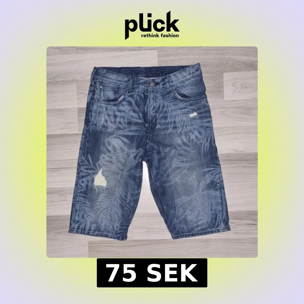 Snygga blå denimshorts från H&M med coolt bladmönster i ljusare toner. Klassisk femficksmodell med knapp och dragkedja fram. Materialet är bomull och shortsen har en midwaist passform. Perfekt för dig som gillar streetstyle och vill sticka ut lite extra.