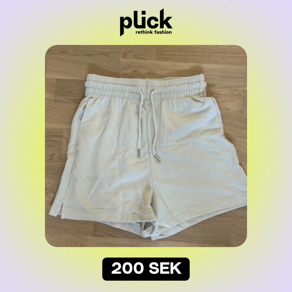 Säljer ett par superbekväma beige/vita shorts från H&M i storlek XS. De har en elastisk midja med snörning och små slitsar på sidorna. Perfekta för sommaren eller en avslappnad dag hemma. Materialet är en blandning av bomull och polyester vilket gör dem både mjuka och hållbara.