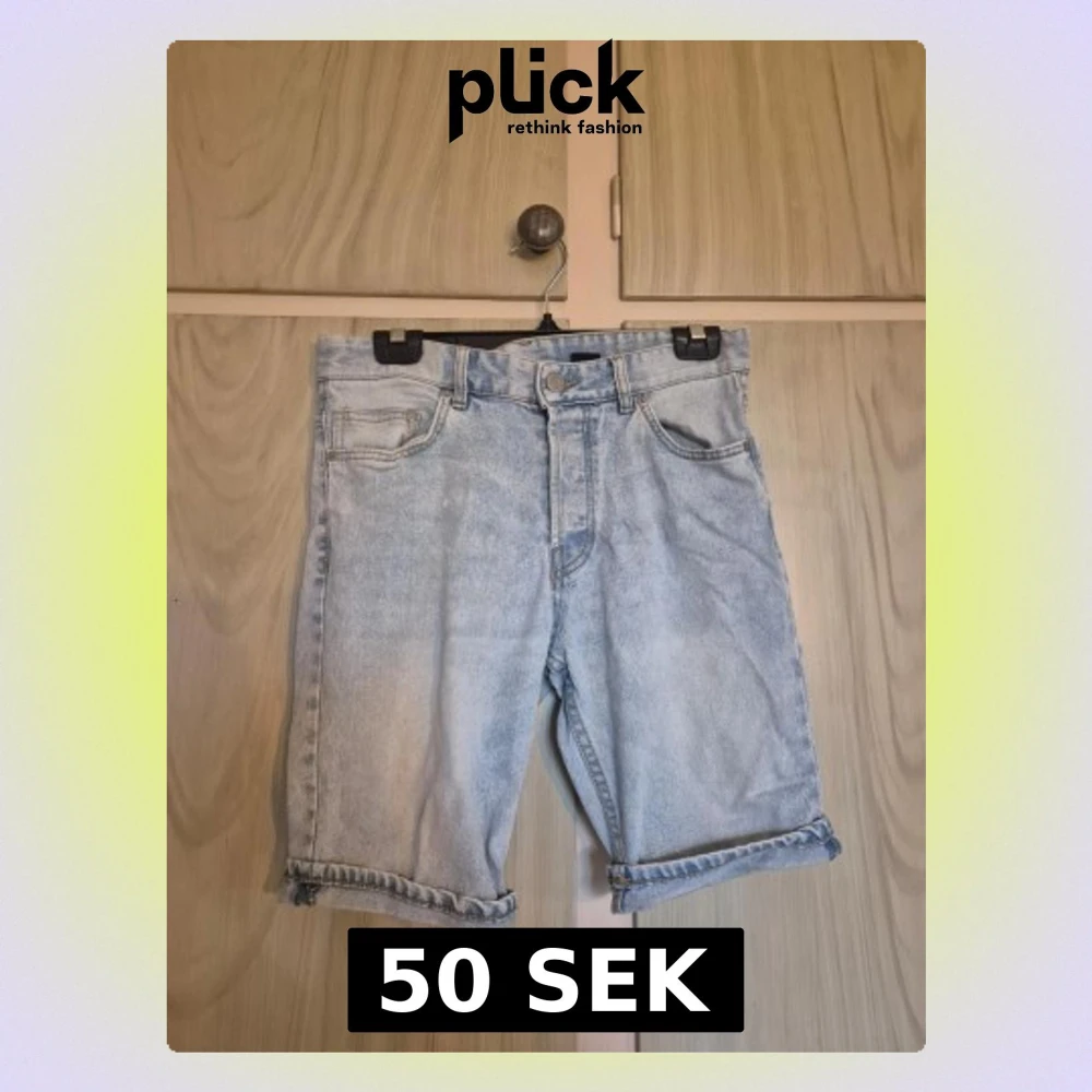 Ljusblå denimshorts med klassisk femficksdesign och uppvikta benslut. Shortsens passform är normal och de har en knapp- och dragkedjeförslutning framtill. Perfekta för varma dagar och har en tidlös look som funkar till många stilar. Alla kläder rollas innan dom skickas hem då det finns katt i hemmet🐈 Jag stryker och tvättar INTE innan jag skickar det får du stå för själv så det blir som du vill ha det🤗