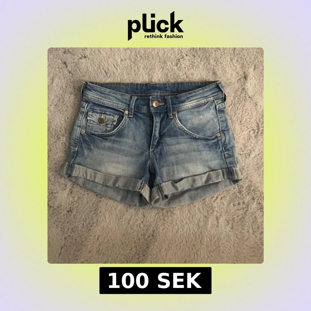 Snygga blå jeansshorts från H&M i klassisk denim med uppvikta benslut och fem fickor. Shortsen har normal passform, knäppning med knapp och dragkedja samt detaljerade sömmar och slitningar för en cool look.