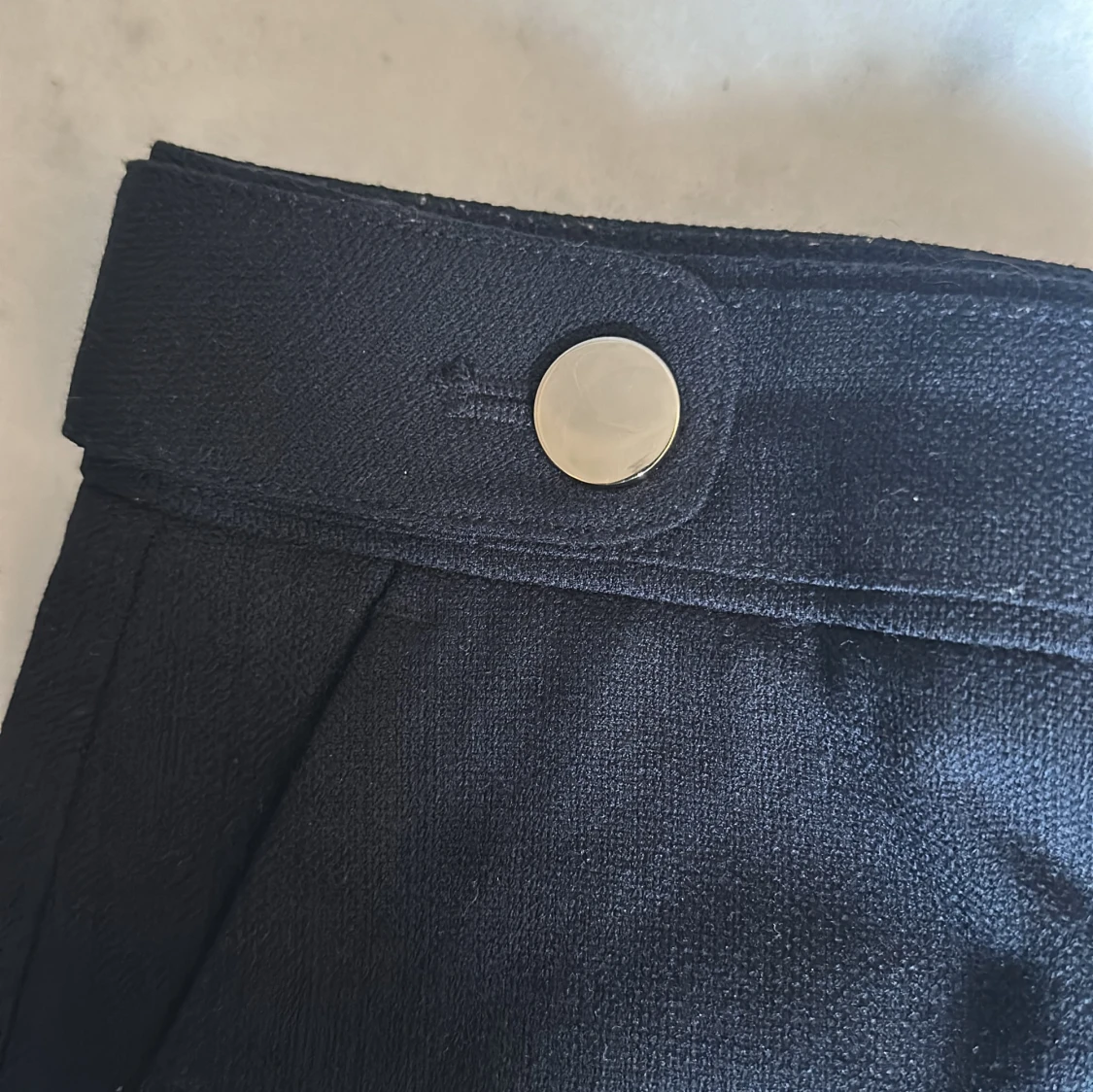 Snygga marinblåa shorts från H&M i storlek 34 med hög midja och stilrena guldfärgade knappar framtill.