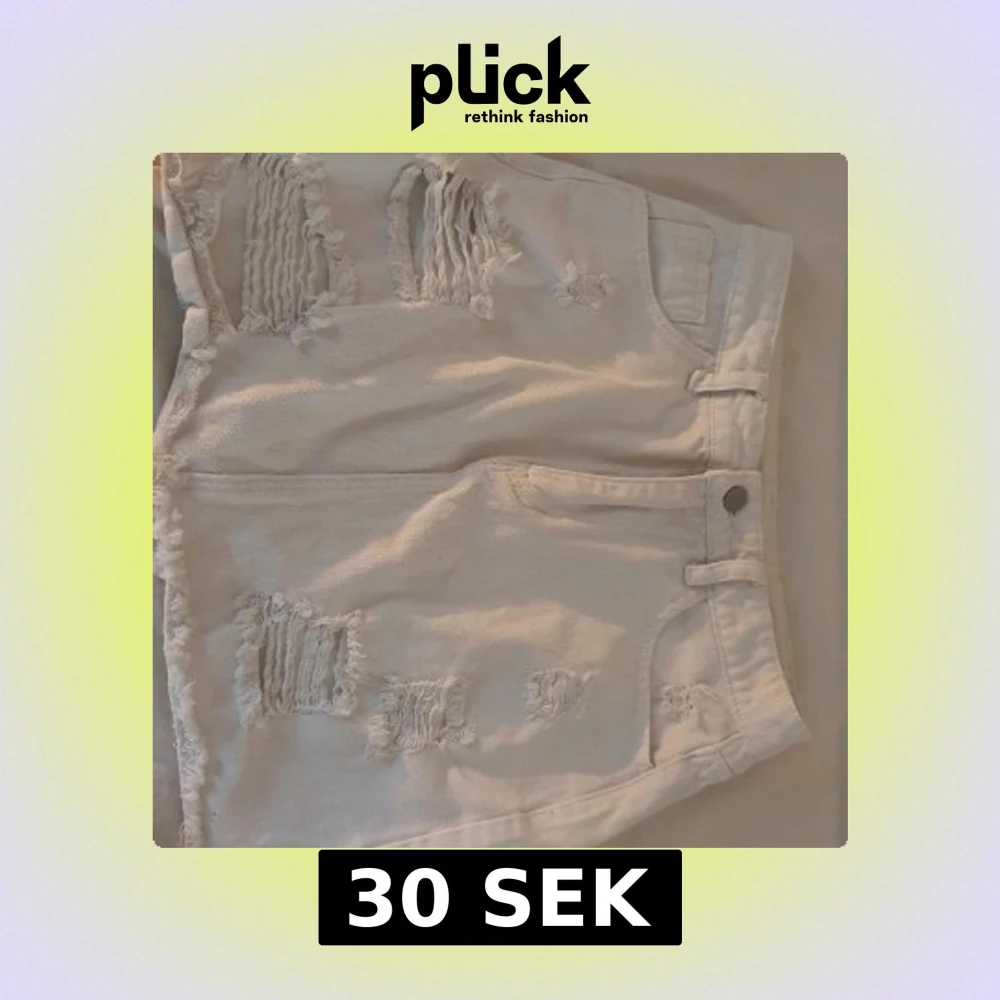 Snygga vita jeansshorts med slitna detaljer och fransig kant. Klassisk femficksmodell med bälteshällor och knappstängning. Perfekta för en chill sommarlook och passar till allt. Råa slitningar framtill ger en trendig vibe.