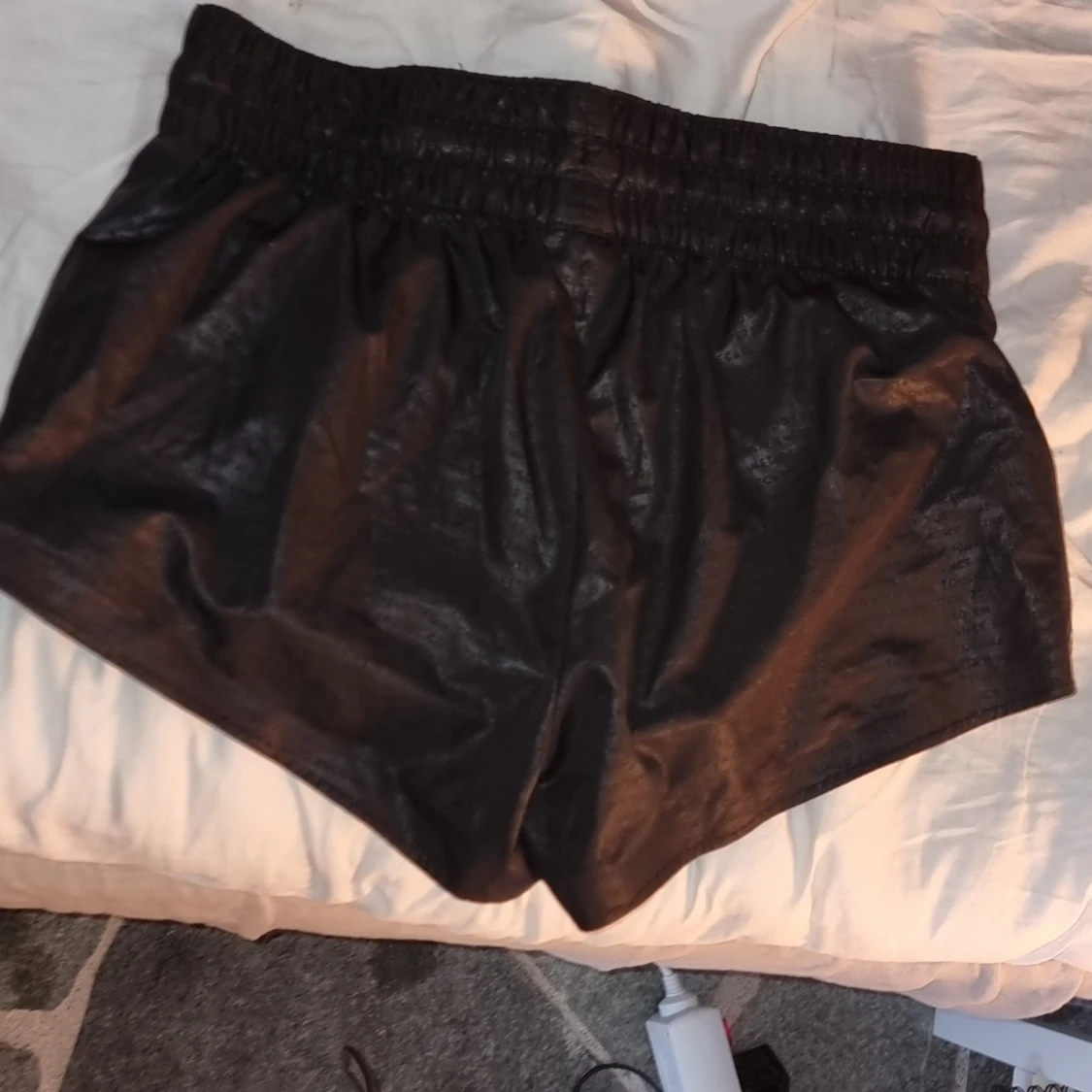 Säljer ett par korta, svarta shorts från H&M med elastisk midja och reflekterande detaljer. Perfekta för träning eller en aktiv dag. Materialet är syntetiskt och aningen glansigt.