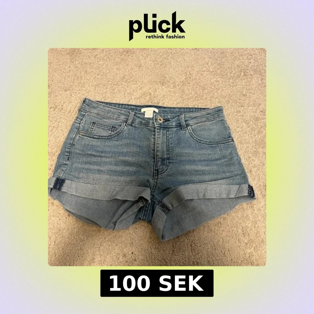 Snygga blå jeansshorts från H&M i storlek 36. Klassisk femficksmodell med uppvikta ben och knappstängning fram. Shortsen har normal passform och är gjorda i mjukt denimtyg som är perfekt för varma dagar.
