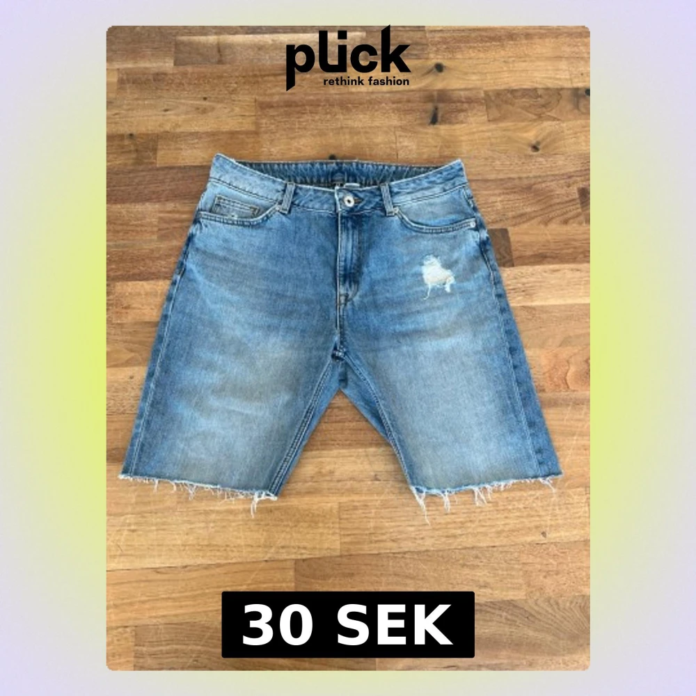 Säljer ett par klassiska blå jeansshorts med rå, fransig kant och slitning på ena låret. Shortsen har fem fickor och knappgylf. Perfekta för en avslappnad stil i sommar.