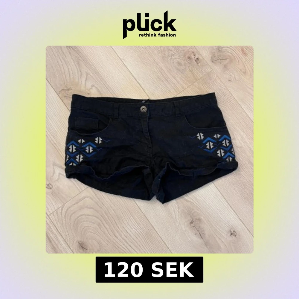 Svarta shorts från H&M i jeansmaterial med blått och vitt broderat mönster på framsidan💞💞