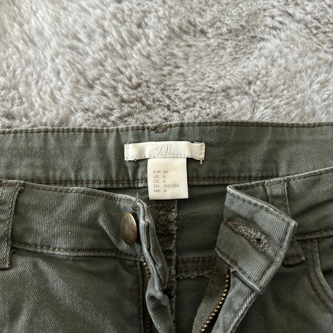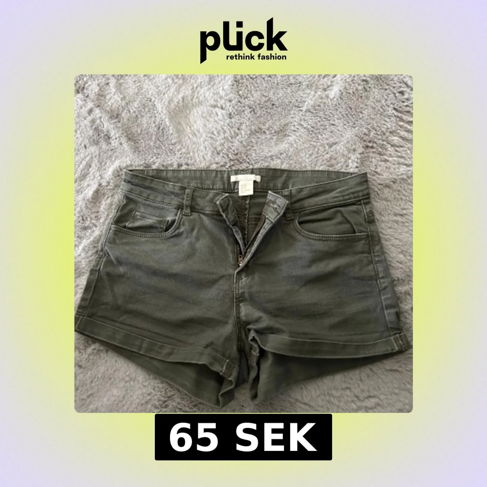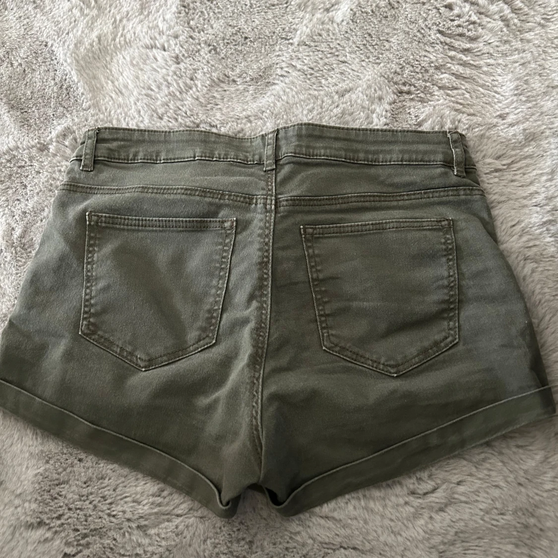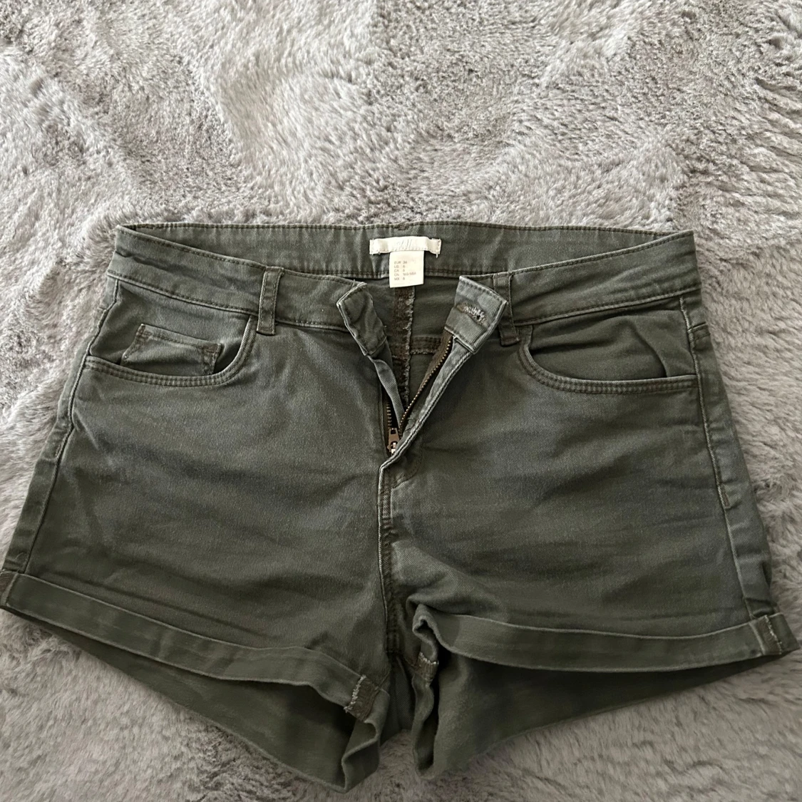 Snygga gröna jeansshorts från H&M i klassisk femficksmodell. De har uppvikta benslut, dragkedja och knapp framtill samt bälteshällor. Perfekta för varma dagar och enkla att matcha med allt. Stl 36.