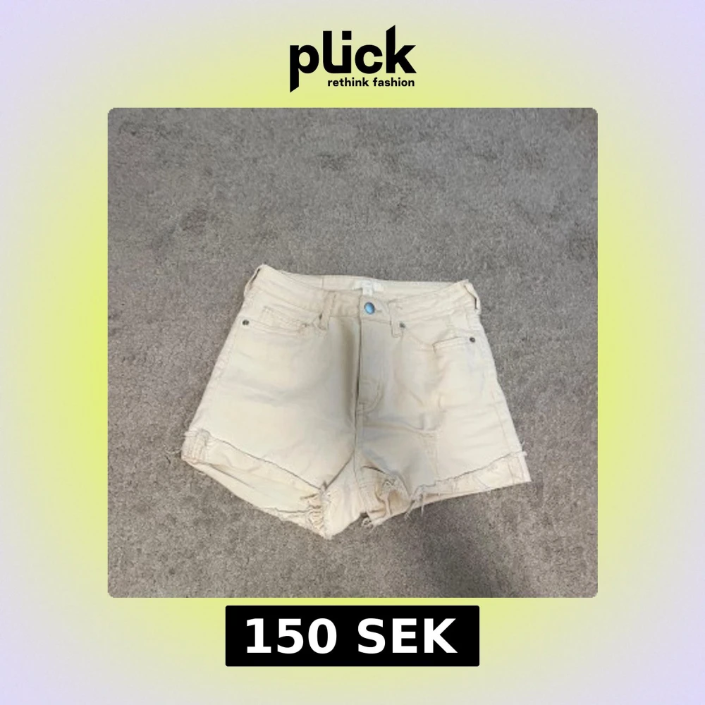 Snygga beige jeansshorts från H&M i storlek 36. Modellen är högmidjad med klassiska fem fickor och råa, fransiga kanter nedtill för en chill vibe. Perfekta för varma dagar och har en enkel knappstängning framtill.