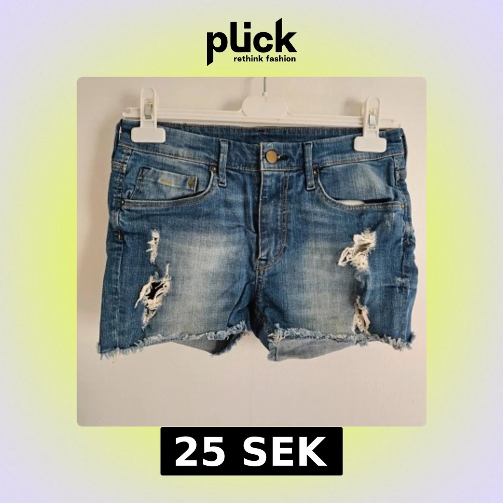 Snygga blå jeansshorts från H&M med rå kant och slitna detaljer framtill. Klassisk femficksmodell med knapp och dragkedja. Materialet är 98% bomull och 2% elastan för skön stretch. Perfekta för sommarens chill dagar.