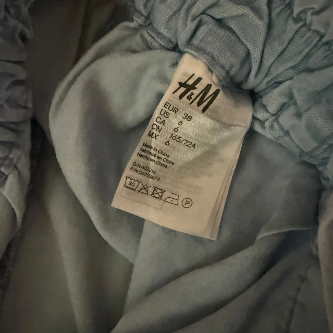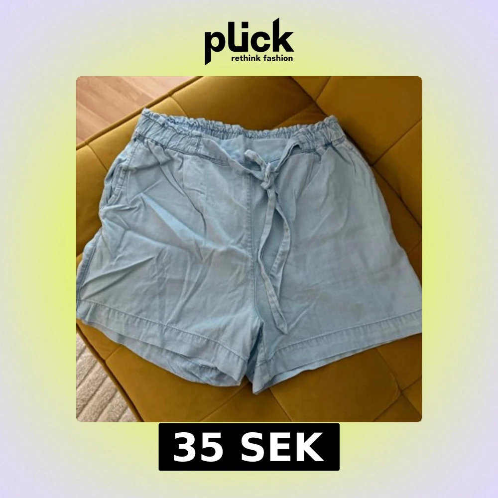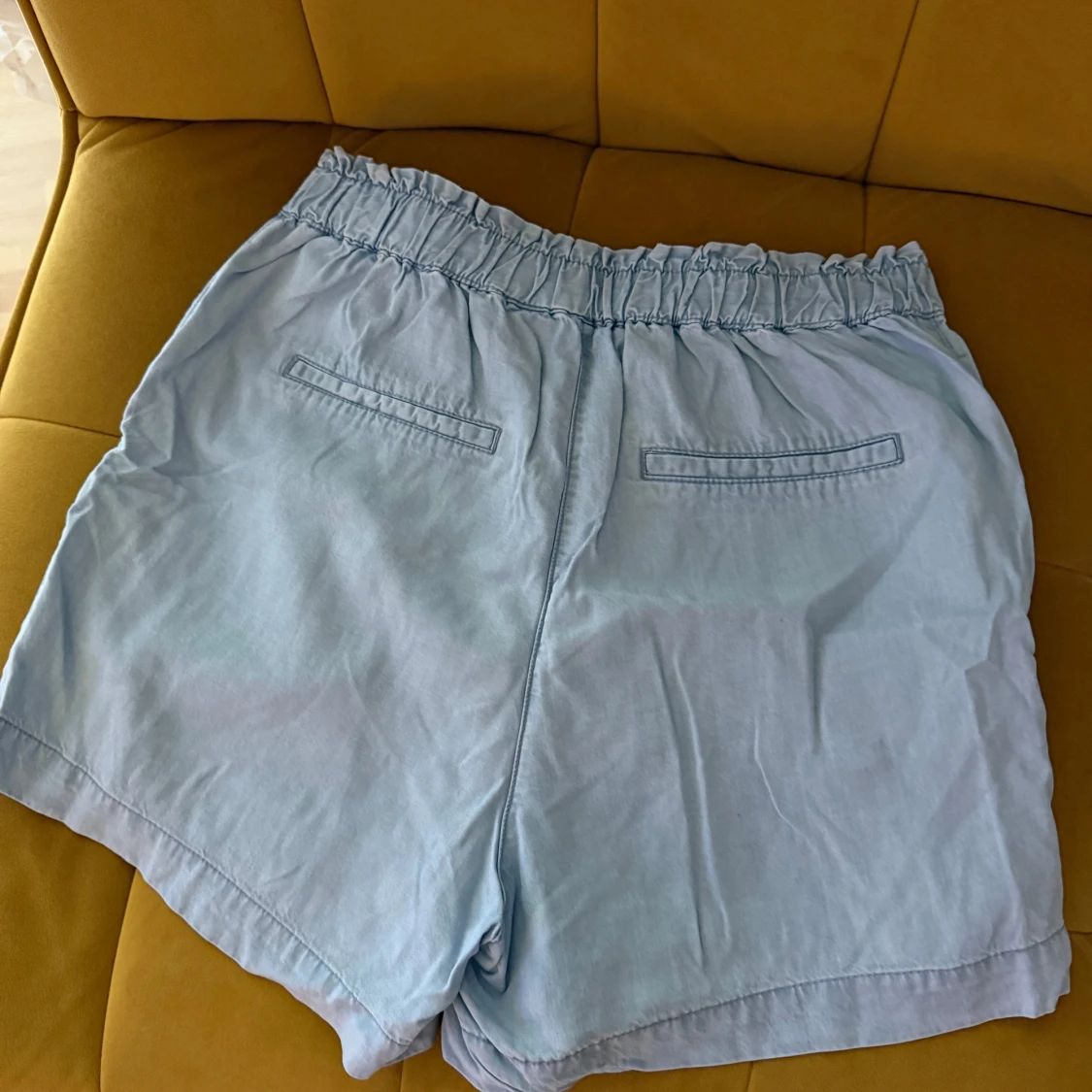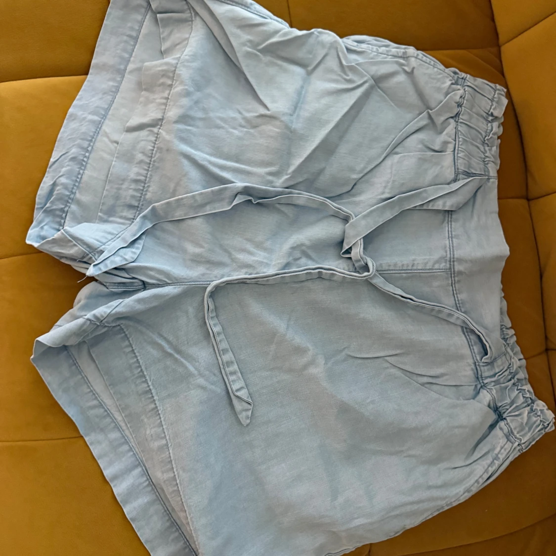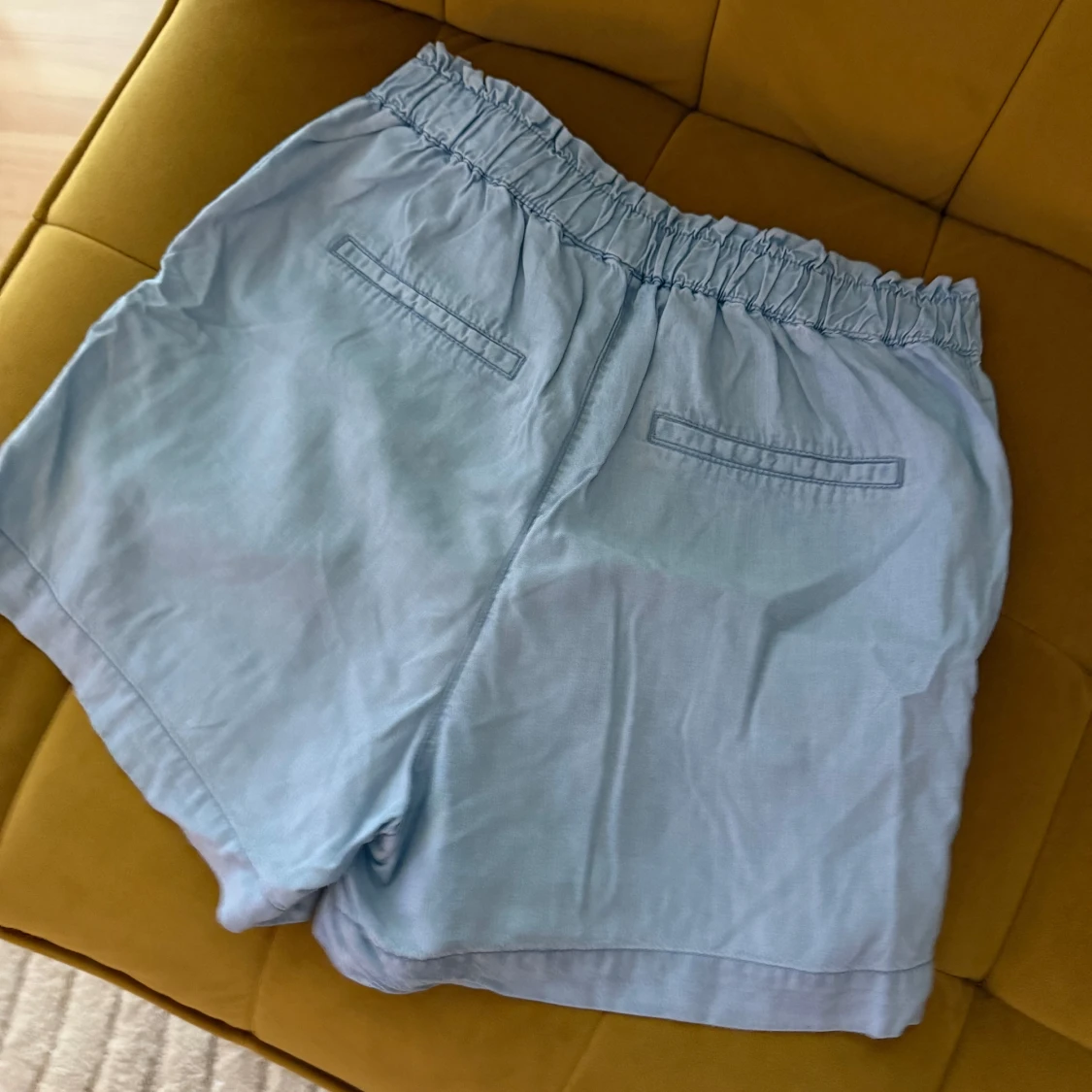 Superbekväma ljusblå shorts från H&M med elastisk midja och knytband framtill. De har två sidfickor och två bakfickor för en chill look. Perfekta för varma dagar och lätta att matcha med allt. Materialet känns mjukt och luftigt.