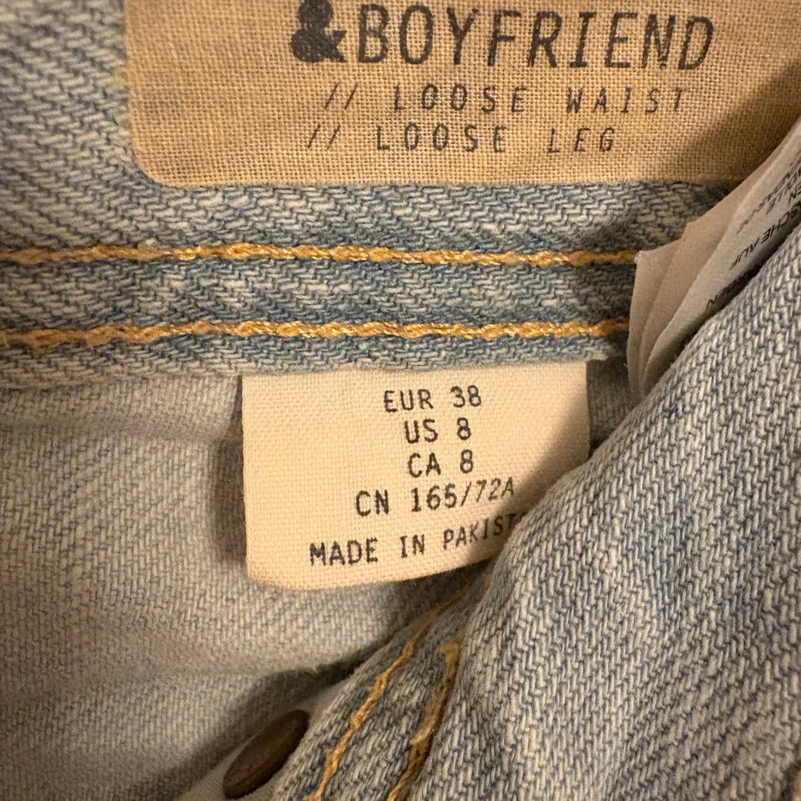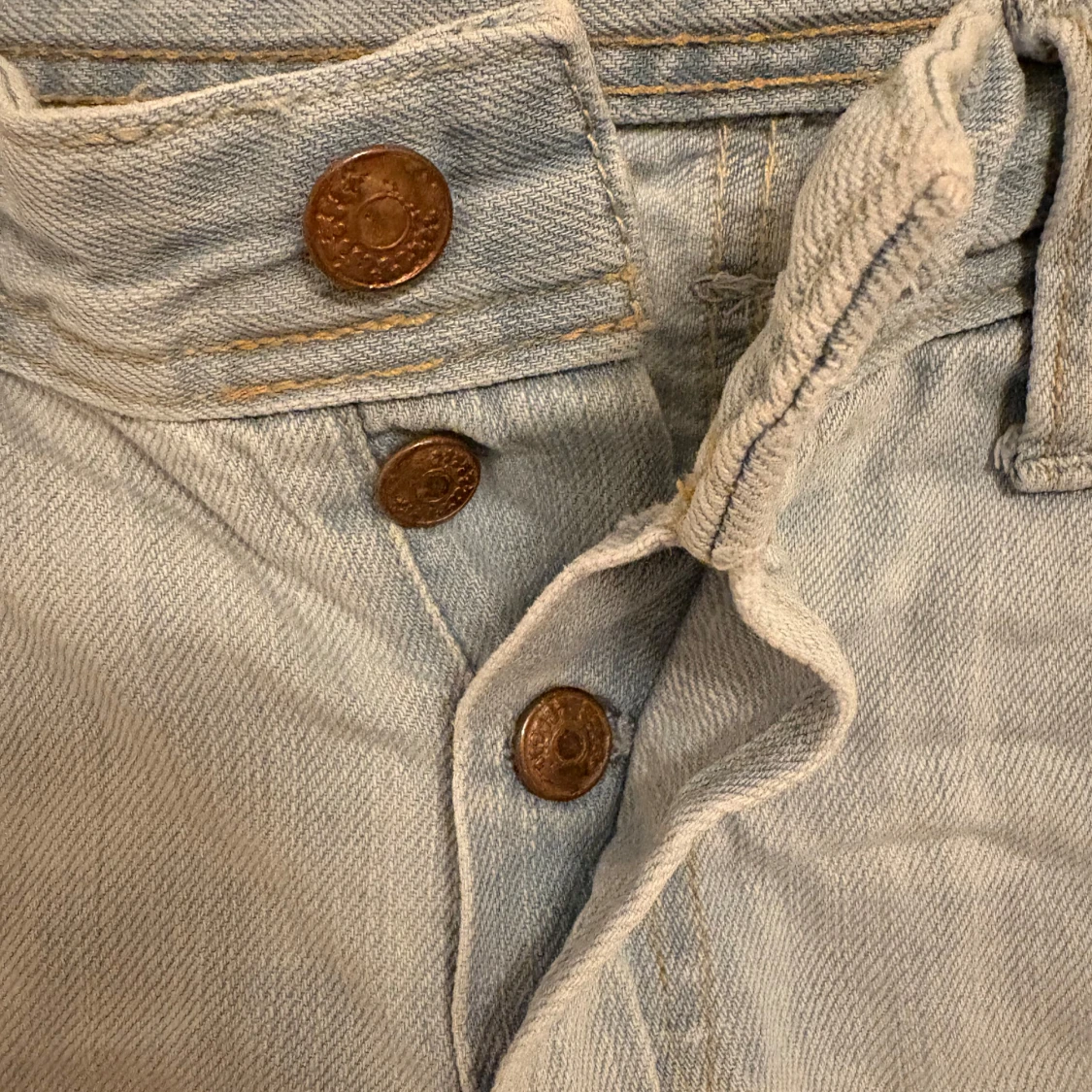 Säljer ett par ljusa jeansshorts från H&M i boyfriend-stil. De har en loose fit med knappar framtill och är tillverkade i 100% bomull.