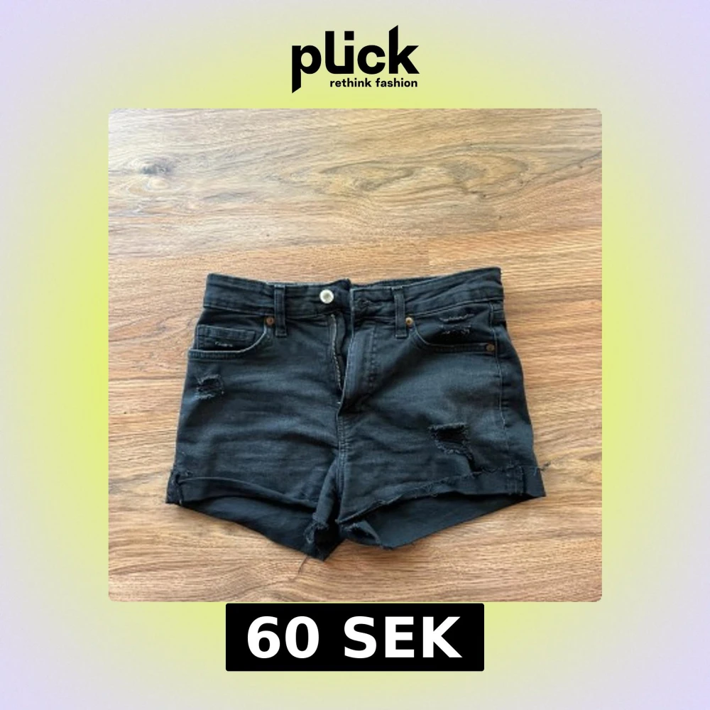 Svarta jeansshorts från H&M i klassisk femficksmodell med råa kanter och slitna detaljer. De har knapp och dragkedja framtill samt bälteshällor. Perfekta för en chill och edgy stil under varma dagar.