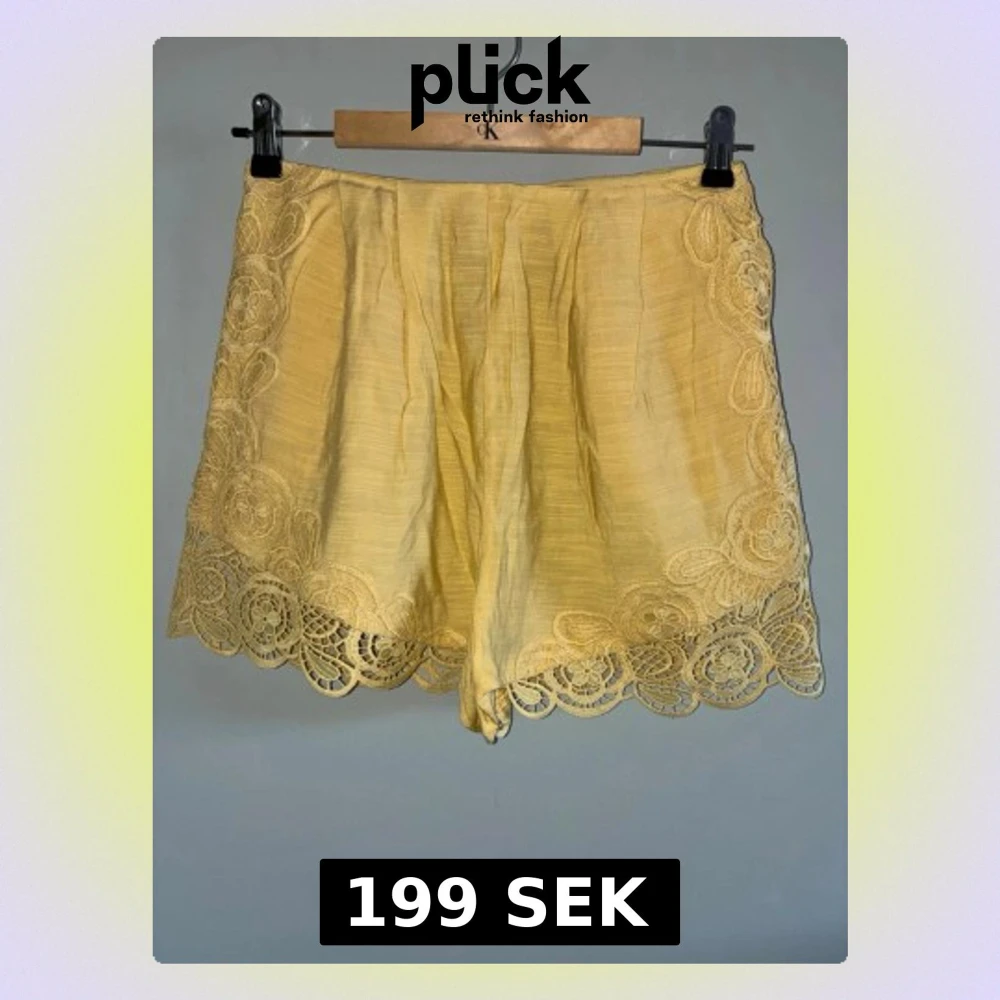 Snygga ljusgula shorts med breda ben och vackra spetsdetaljer längs kanterna. Tillverkade i ett lätt linneliknande material som passar perfekt till varma dagar. Shortsen har hög midja och en feminin look med fina broderade mönster.