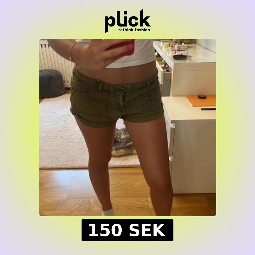 Snygga olivgröna line shorts med låg midja och knappdetaljer. Perfekta för varma sommardagar. De har en tight passform och är tillverkade i ett bekvämt material. Dom är andvända 1 gång för fel storlek. Fråga om mer bilder eller mått om ni vill (Lånade bilder)