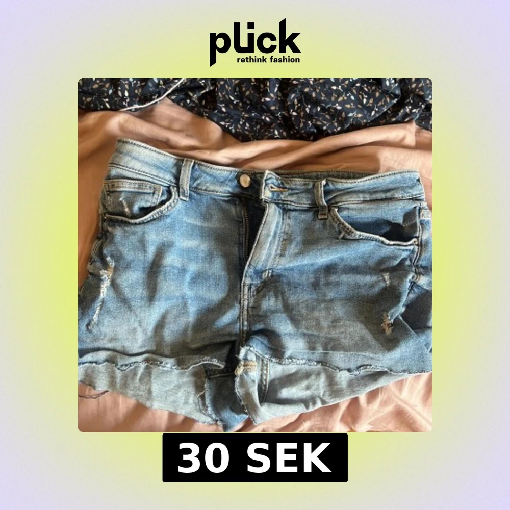 Snygga blå jeansshorts från H&M i storlek 44. Klassisk femficksmodell med råa kanter och slitna detaljer för en avslappnad vibe. Perfekta till sommaren och lätta att matcha med allt. Dragkedja och knapp framtill.