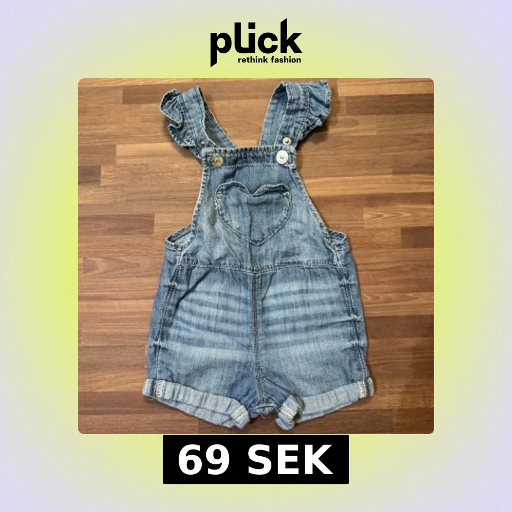 Söta blå hängselshorts från H&M i storlek 68 (4-6mån). Jeansimitation, väldigt mjukt och skönt material. Volangdetaljer på axelband, knappar i metall och uppvikta benslut. Helt oanvänd, endast upptvättad.