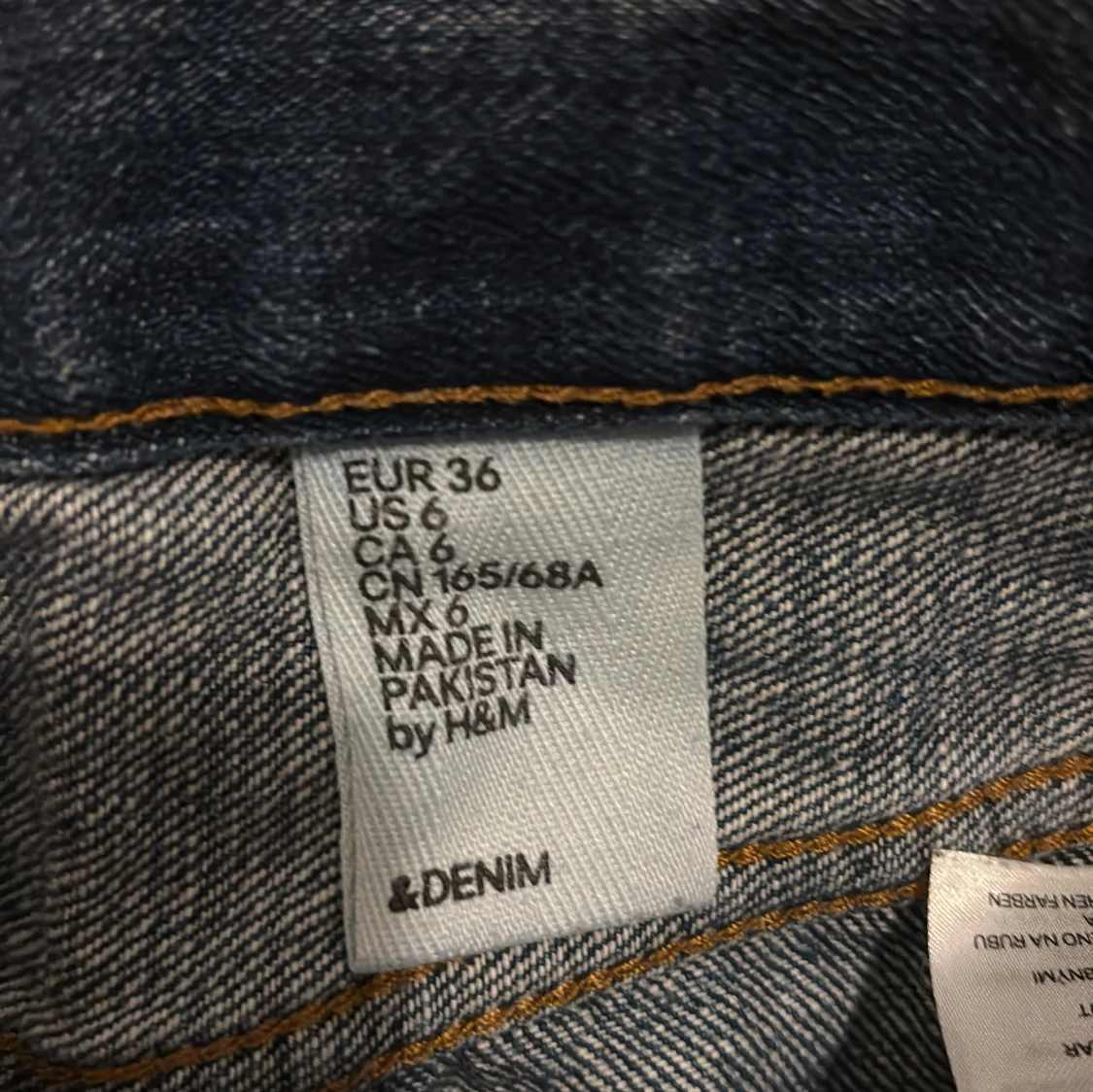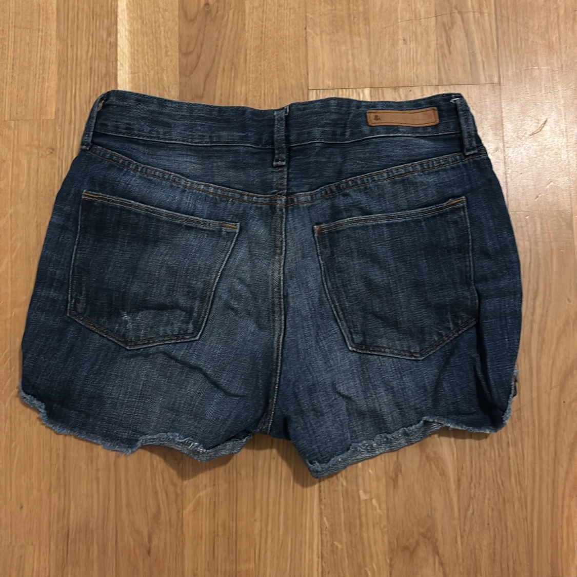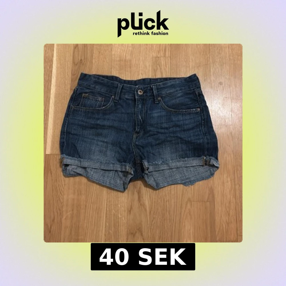 Säljer ett par mörkblå jeansshorts från H&M. De har en klassisk femficksdesign och är uppvikta vid bensluten för en avslappnad look. Perfekta för varma sommardagar!