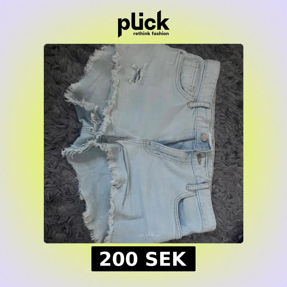 Ljusblå jeansshorts med råa fransade kanter och slitningar framtill. Klassisk femficksmodell med knapp och dragkedja. Perfekta för varma dagar och enkel att matcha med olika toppar. Finns liten fläck vid fickan!