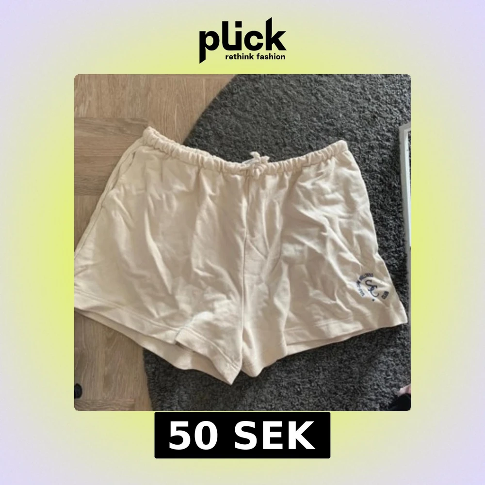 Superbekväma beige shorts med elastisk midja och snörning. Tillverkade i mjukt bomullstyg och har en liten blå logga på ena benet. Perfekta för chill dagar eller träning. Lätta att matcha med en hoodie eller t-shirt.