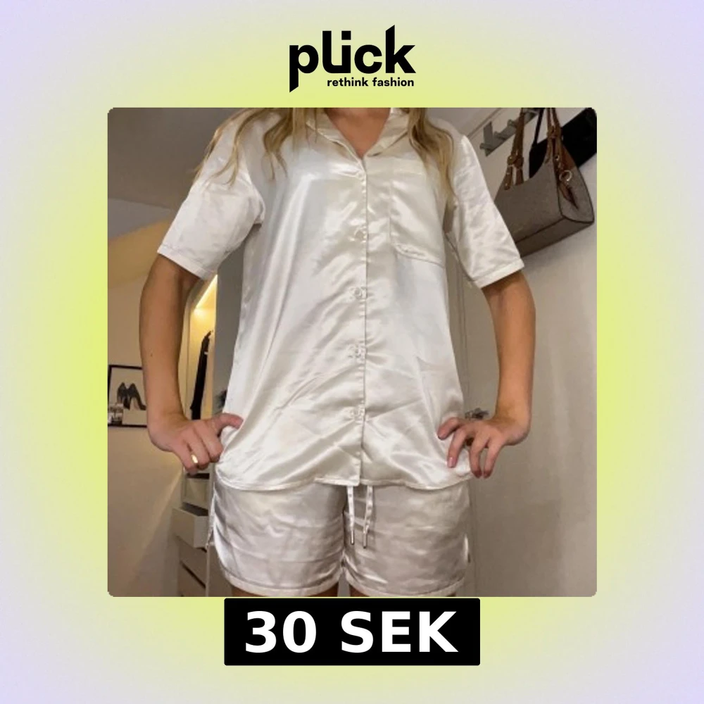 Snygga, glansiga pyjamasshorts i vit satin med elastisk midja och snörning. De är korta och har en avslappnad passform, perfekta för chill dagar eller mysiga nätter. Matchar toppen i samma material för en hel look. Säljer hela sättet så tröja och shorts.