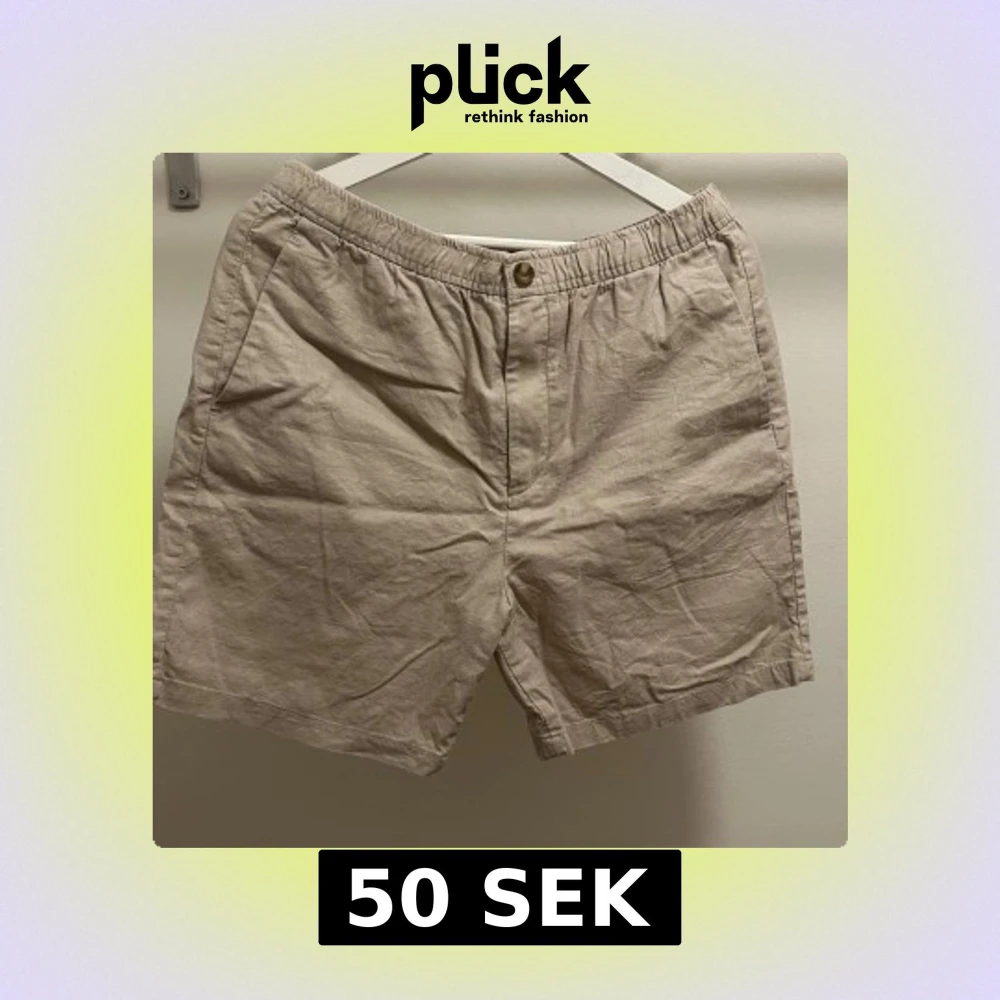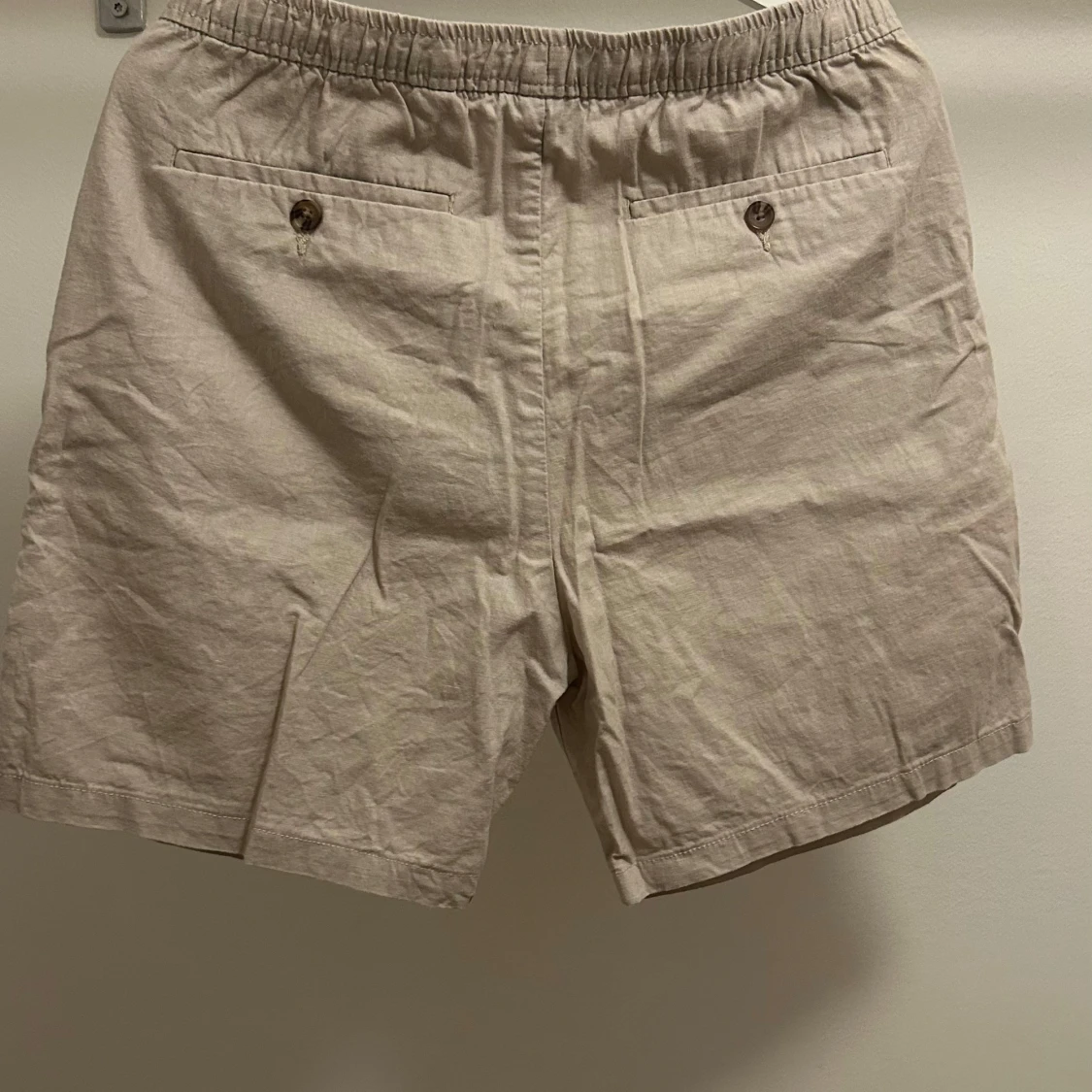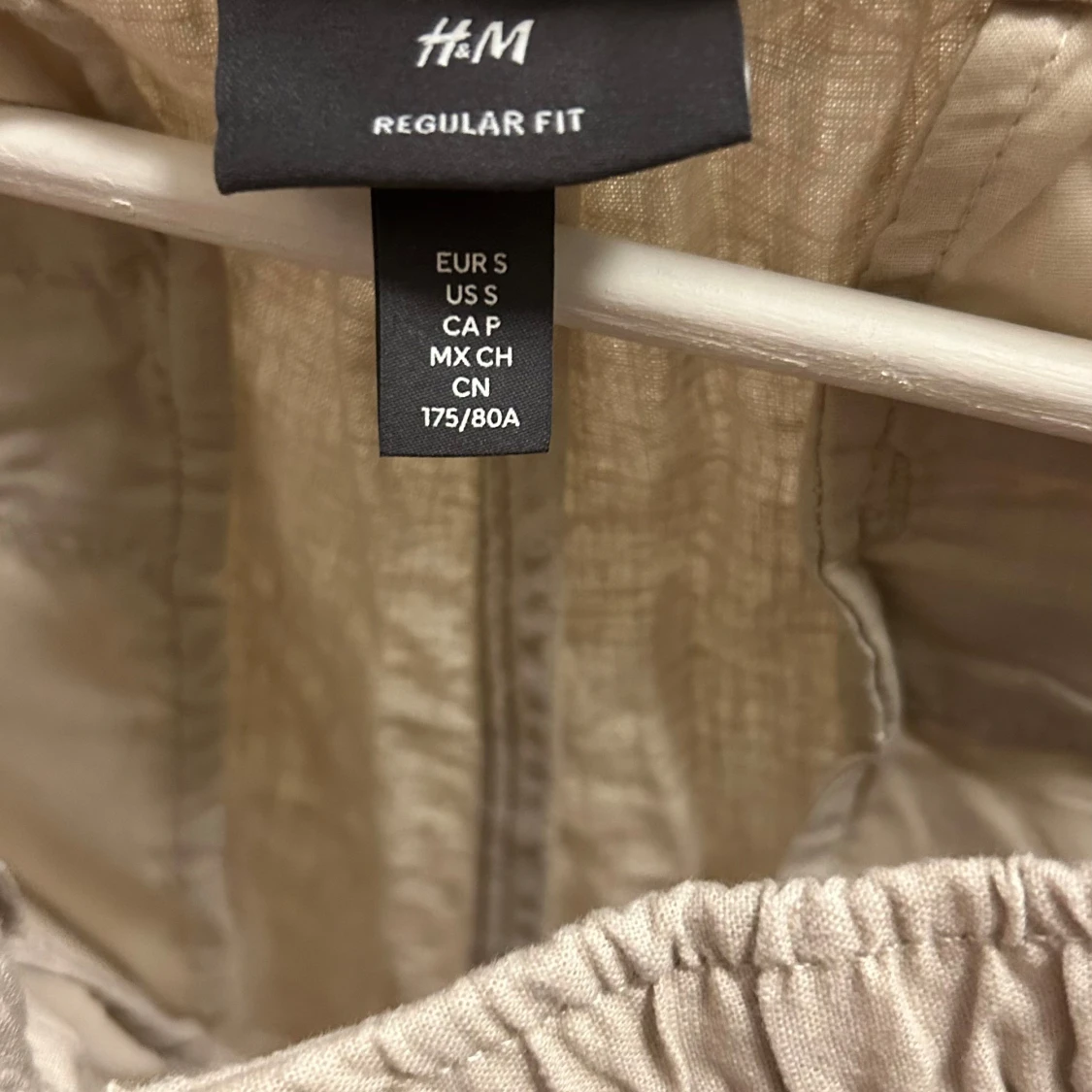 Snygga beige shorts från H&M i regular fit med elastisk midja och knäppning fram. Tillverkade i svalt linne, perfekta för varma dagar. Två sidofickor och två bakfickor med knapp för en clean look.