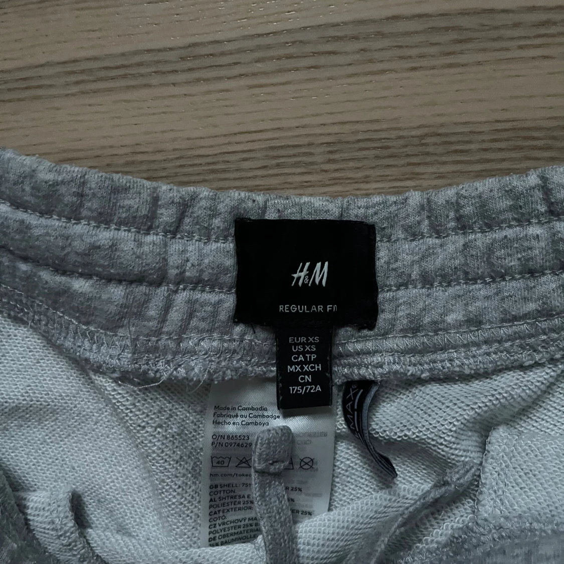 Mysiga grå sweatshorts från H&M i storlek XS. De har en relaxed passform, elastisk midja med snörning och två sidofickor. Perfekta för chill dagar eller träning. Materialet är mjuk bomullsmix som känns skönt mot huden.