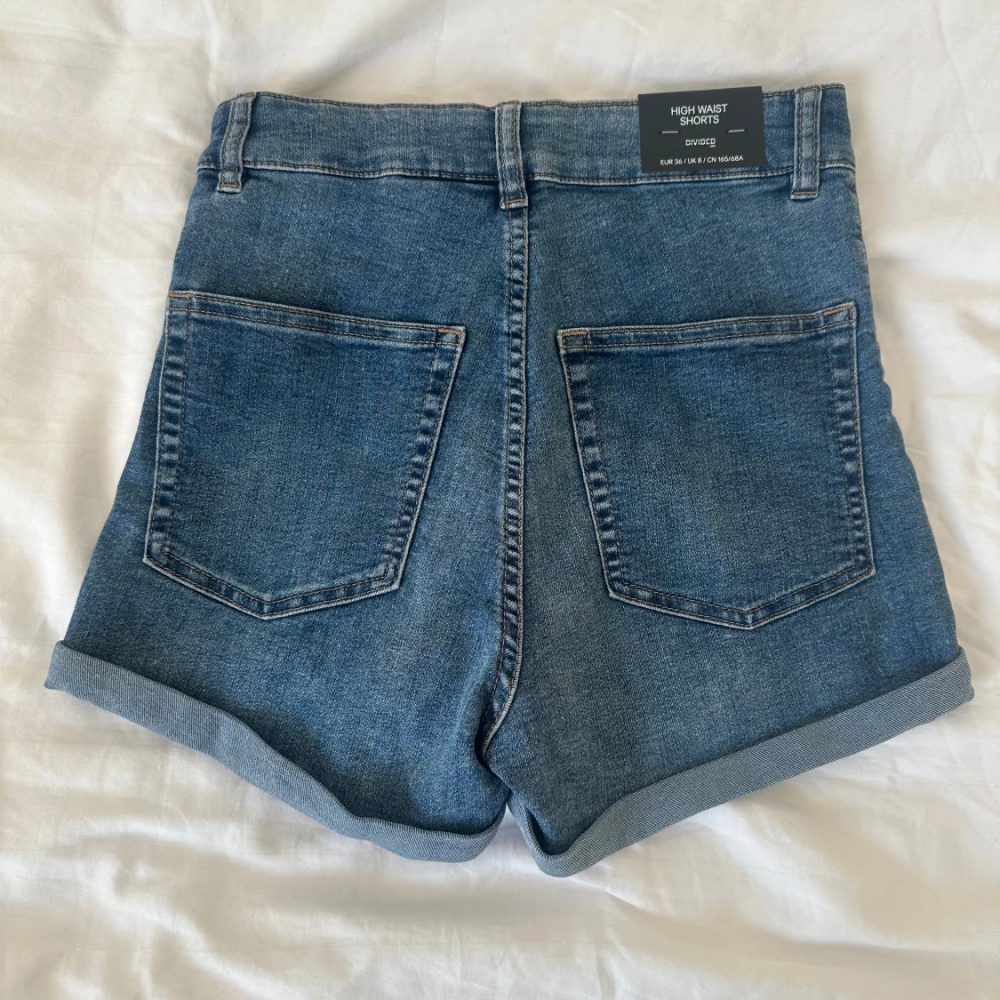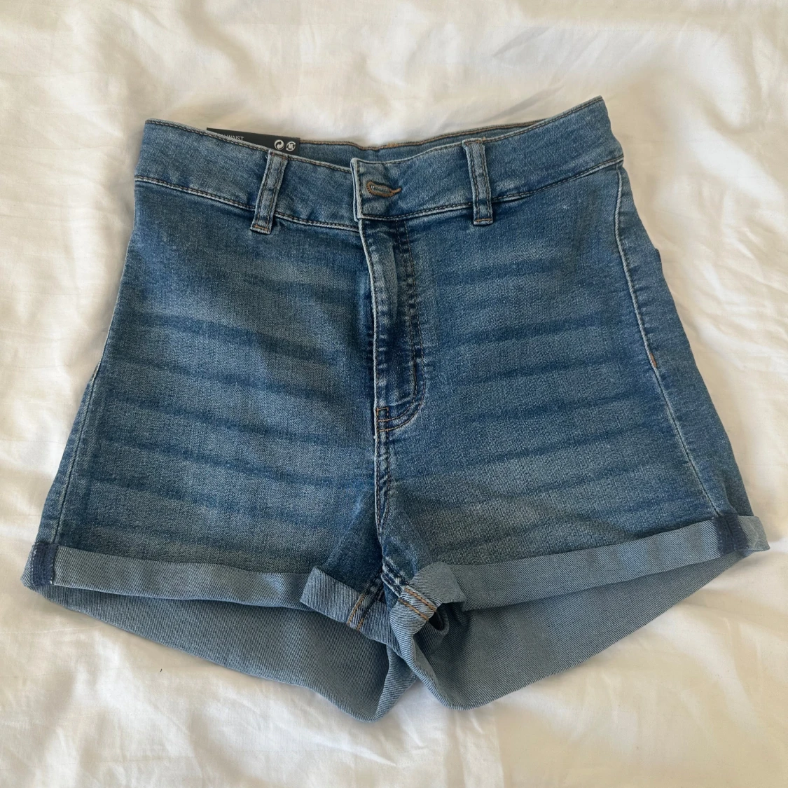 Blåa högmidjade jeansshorts från Divided med klassisk femficksdesign, uppvikta benslut och bälteshällor. Perfekta för varma dagar och enkel att matcha med allt. Snygg och tidlös modell som alltid funkar