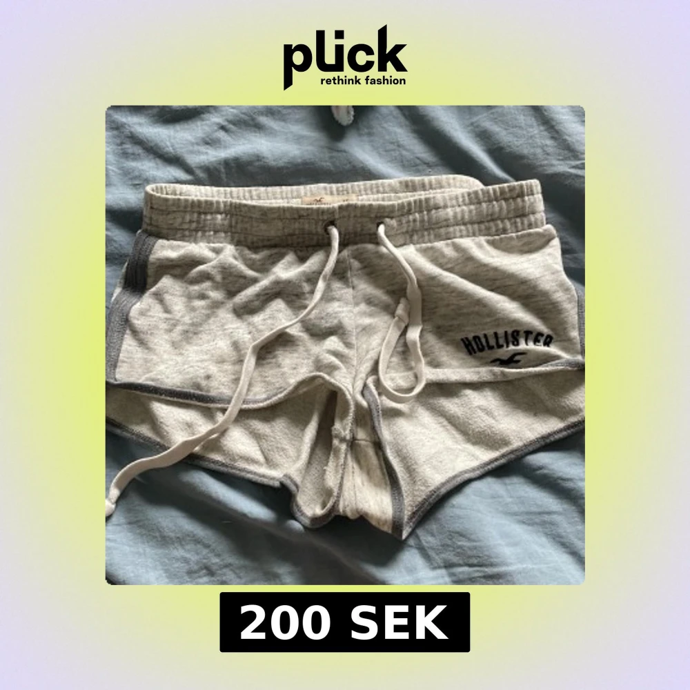 Superbekväma ljusgrå mjukisshorts från Hollister med mörkgrå kanter och vit dragsko i midjan. Shortsen har en broderad Hollister-logga på ena benet och är perfekta för en avslappnad stil.