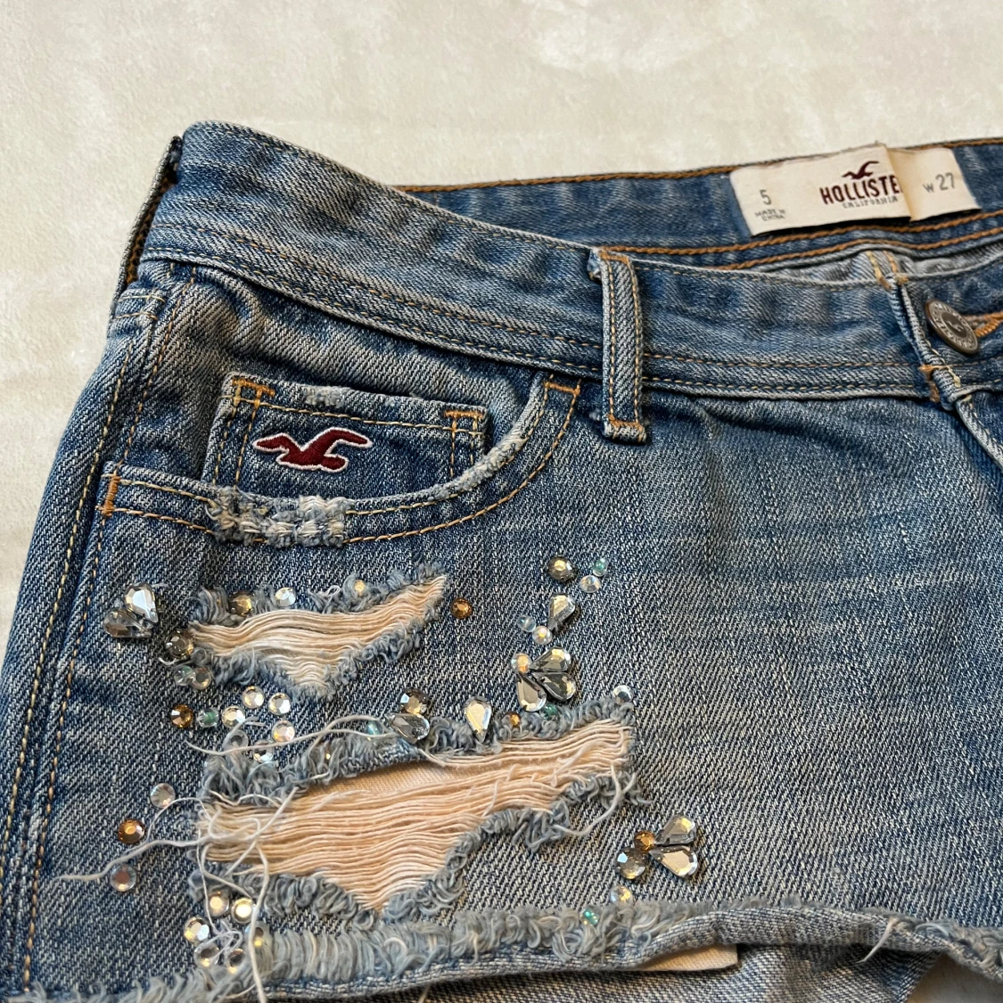 Säljer dessa jättesnygga hollister shortsen med paljetter! Midjemåttet är 39cm!🤍