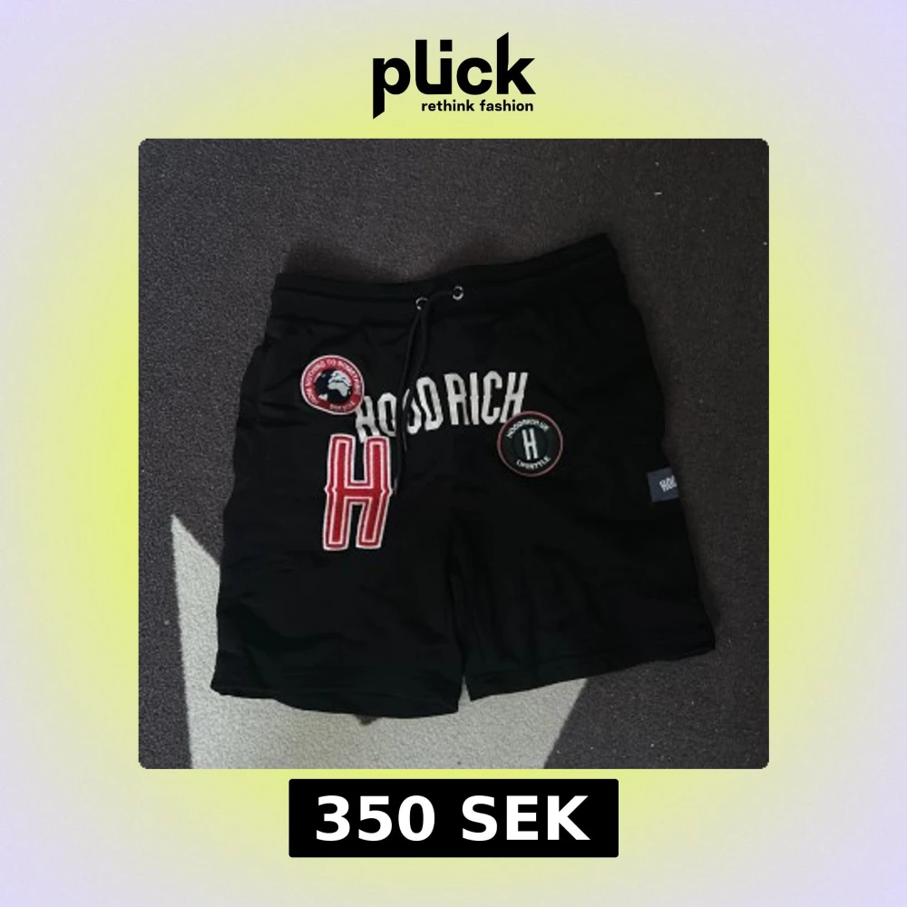 Svarta shorts från Hoodrich med feta broderade patchar och loggor framtill. Snygg snörning i midjan och coola detaljer som sticker ut. Materialet känns mjukt och skönt, perfekt för chill eller streetwear. Hoodrich-etikett på sidan och tryck även baktill.