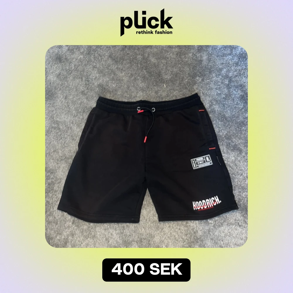 Säljer ett par svarta shorts från Hoodrich i storlek herr XL. De har en elastisk midja med dragsko och coola detaljer som en vit logga och en etikett på sidan. Perfekta för en avslappnad stil i sommar!