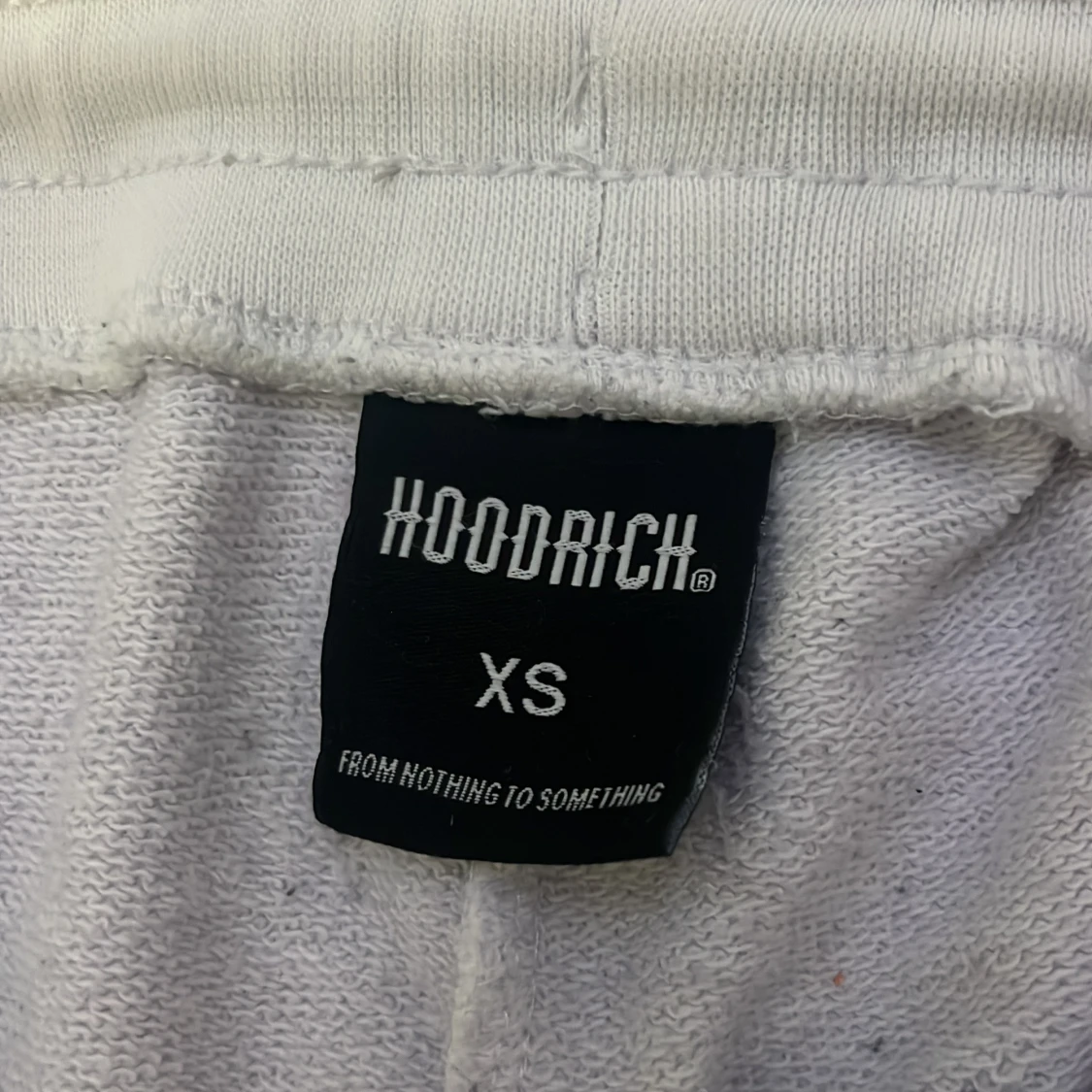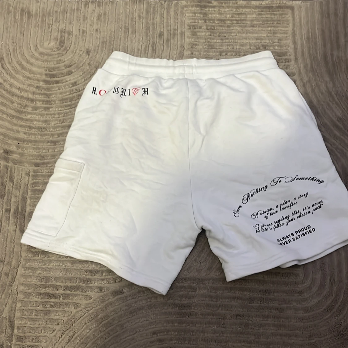 Säljer ett par vita shorts från Hoodrich i storlek XS. De har stor svart och röd logotyp framtill, textdetaljer bak och en ficka med dragkedja på sidan. Fick dessa för 1 år sen och använde dom ett bra tag. Inga synliga skador eller fläckar på shortsen.