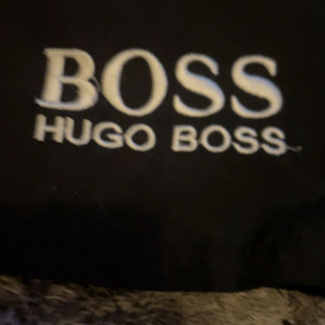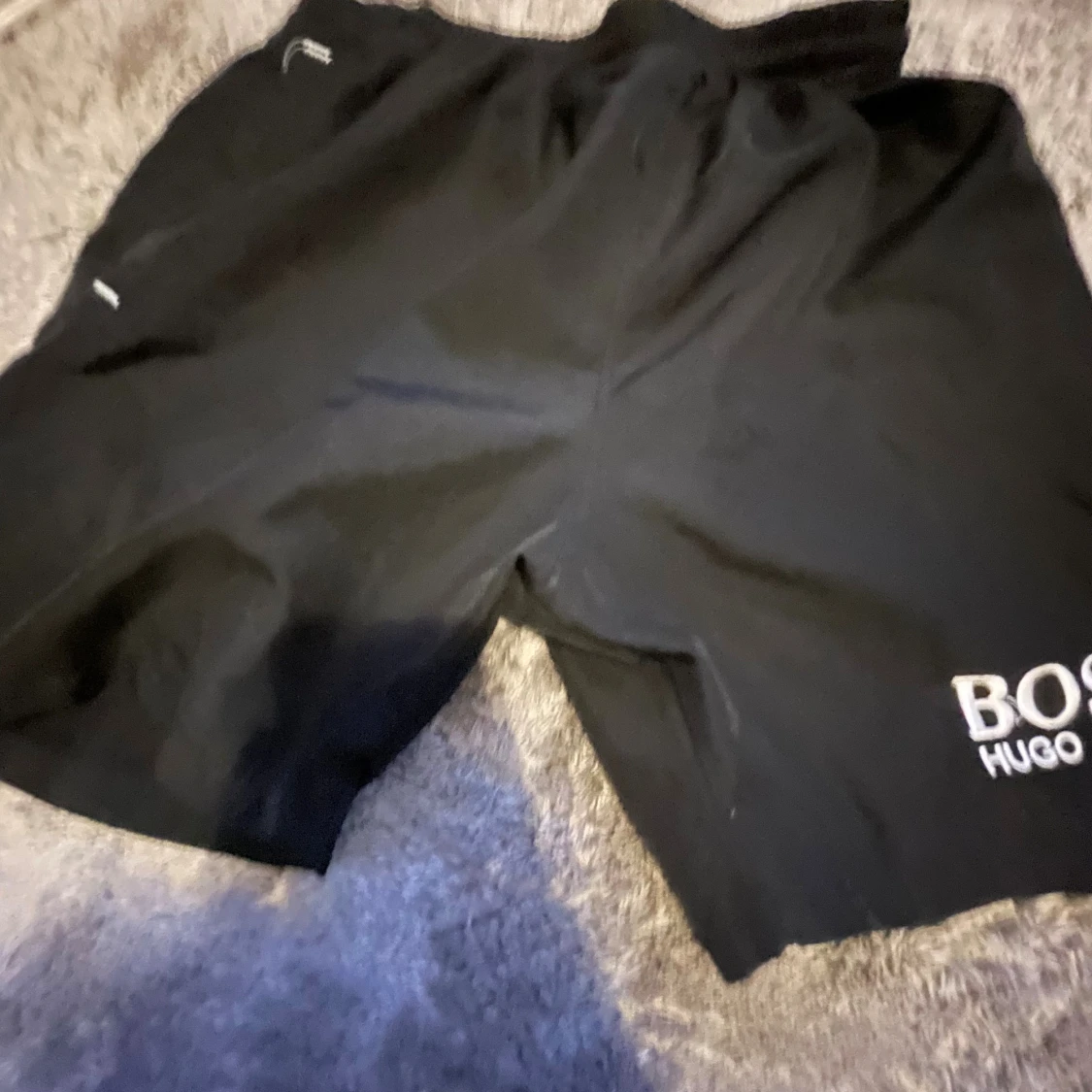 Svarta shorts från Hugo Boss med vit broderad logga på benet. De har vit snörning i midjan och meshfoder på insidan. Perfekta för sommaren och har en clean, sportig vibe.