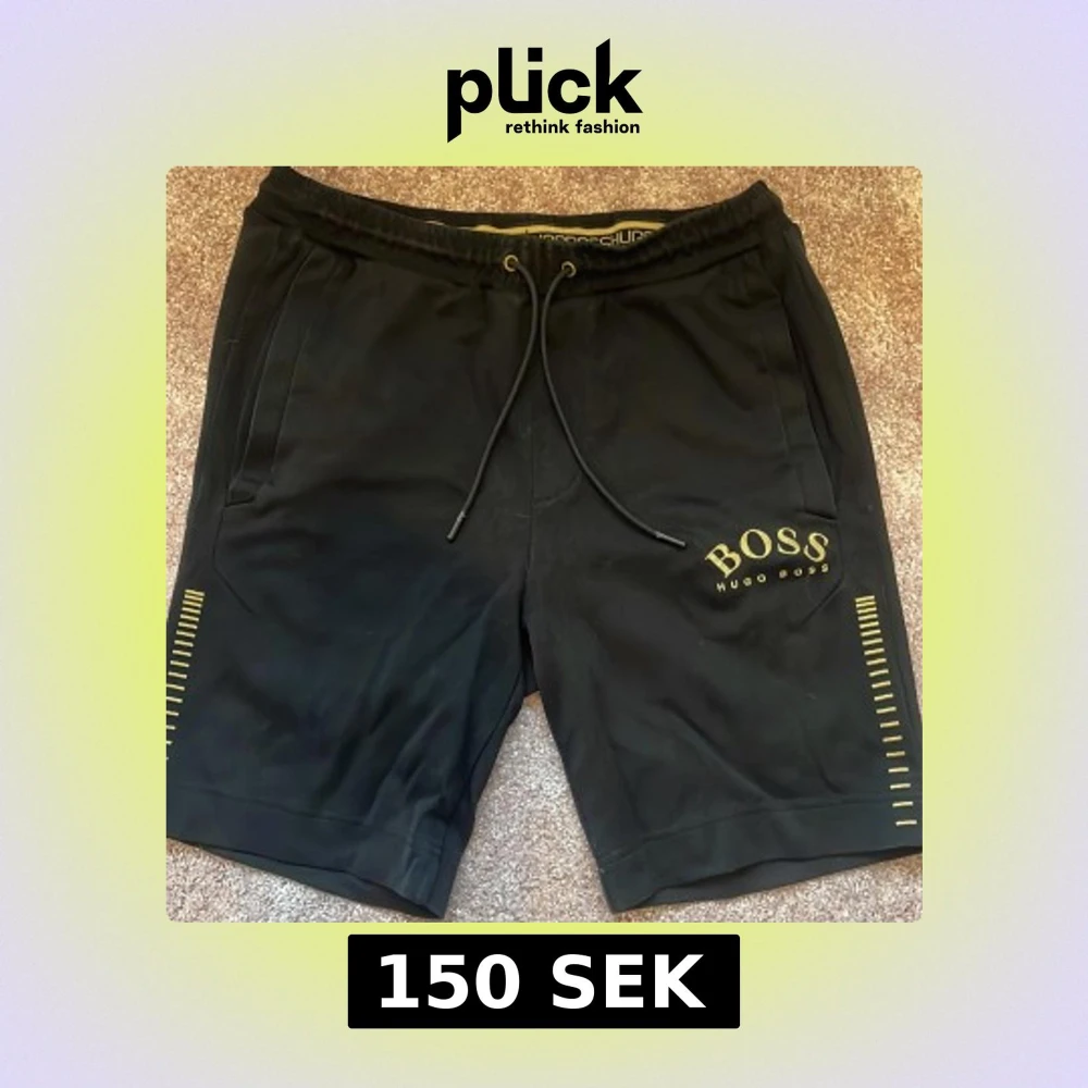 Snygga svarta shorts från Hugo Boss med gul broderad logga och detaljer på benen. De har snörning i midjan och bekväma sidofickor. Perfekta för dig som vill ha en clean och stilren look med lite lyxig vibe.