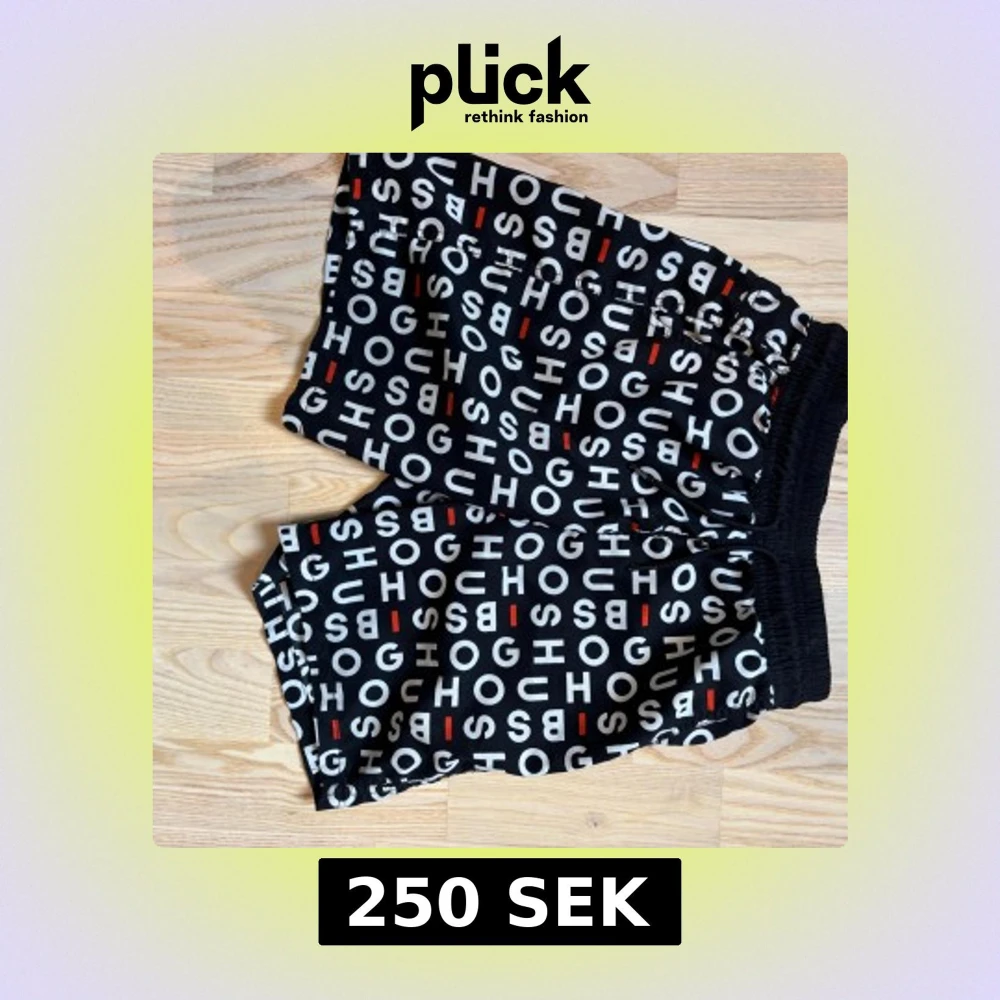 Snygga svarta shorts från Hugo Boss i storlek XS med elastisk midja. Shortsen har ett coolt grafiskt mönster med vita och röda bokstäver över hela tyget. Materialet är mjukt och lätt, perfekt för varma dagar. Passformen är loose och de har fickor på sidorna.